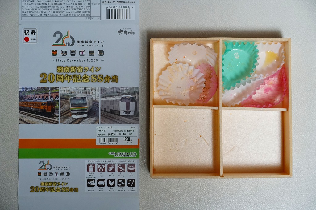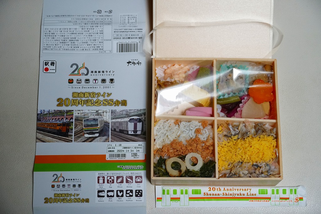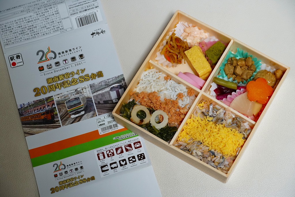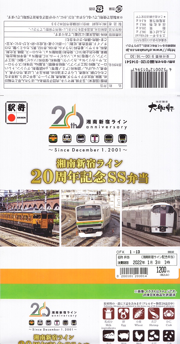 2021(令和3)年12月1日に大船駅その他神奈川県内や東京都内の湘南新宿ライン停車駅の駅弁売店やコンビニで発売。JR東日本横浜支社が湘南新宿ライン20周年記念スタンプラリー期間中の販売を公表、ということは翌2022(令和4)年1月10日までの販売か。掛紙にはその20年間にここを走った電車のアイコンや写真を使う。