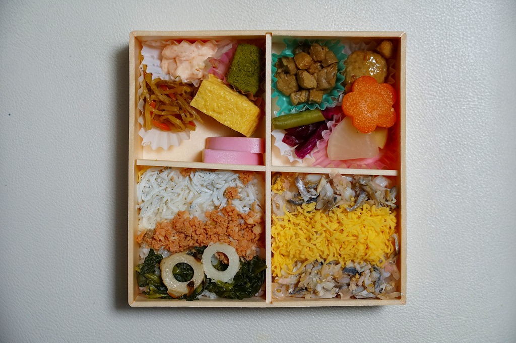 松花堂弁当のような4区画に、アジの酢漬けの刻みと錦糸卵を載せた酢飯、ほうれんそうとちくわの炒め物に鮭フレークとしらすごま油炒めを載せた酢飯、マグロ角煮に根菜の煮物と肉団子と柴漬け、かまぼこと玉子焼と明太ポテトサラダときんぴらごぼうと抹茶きなこわらび餅。「車体カラーをイメージしたトッピングや、人気のおかずを詰め合わせた」のはどこだろうか。