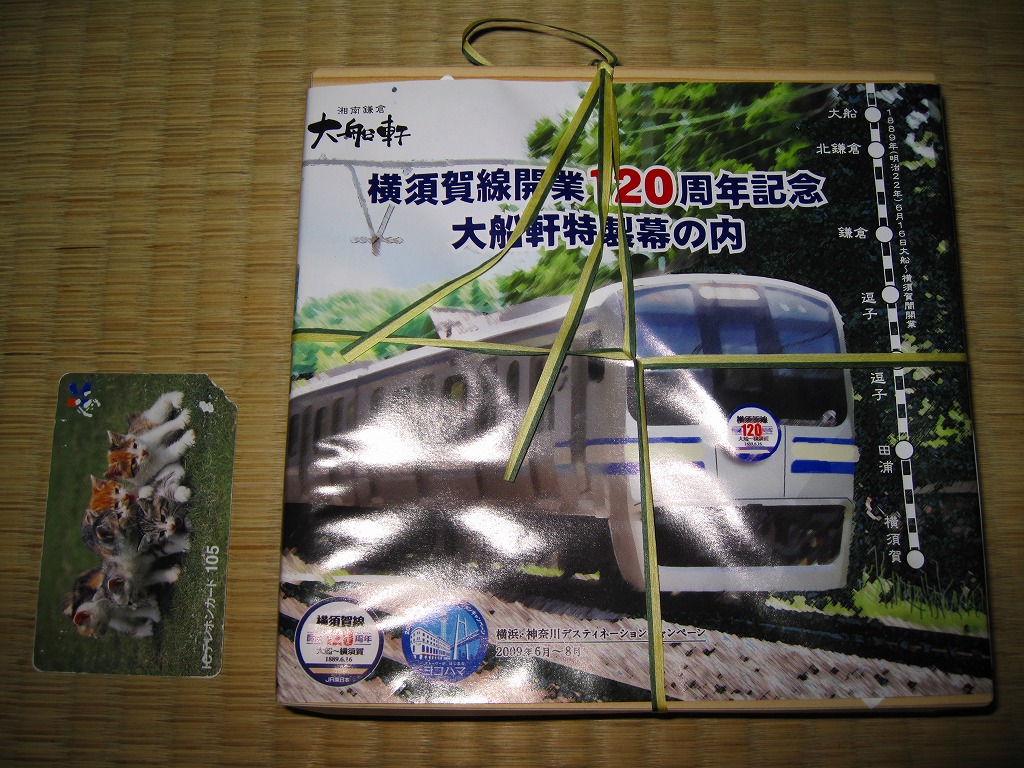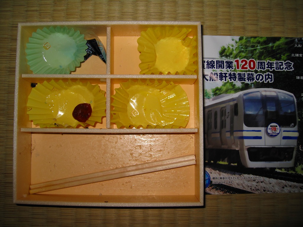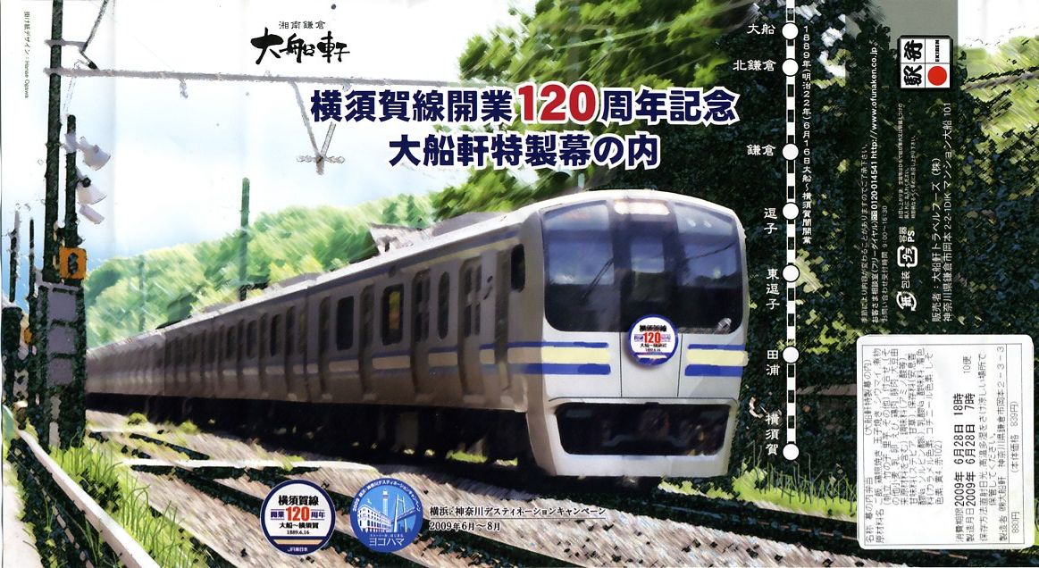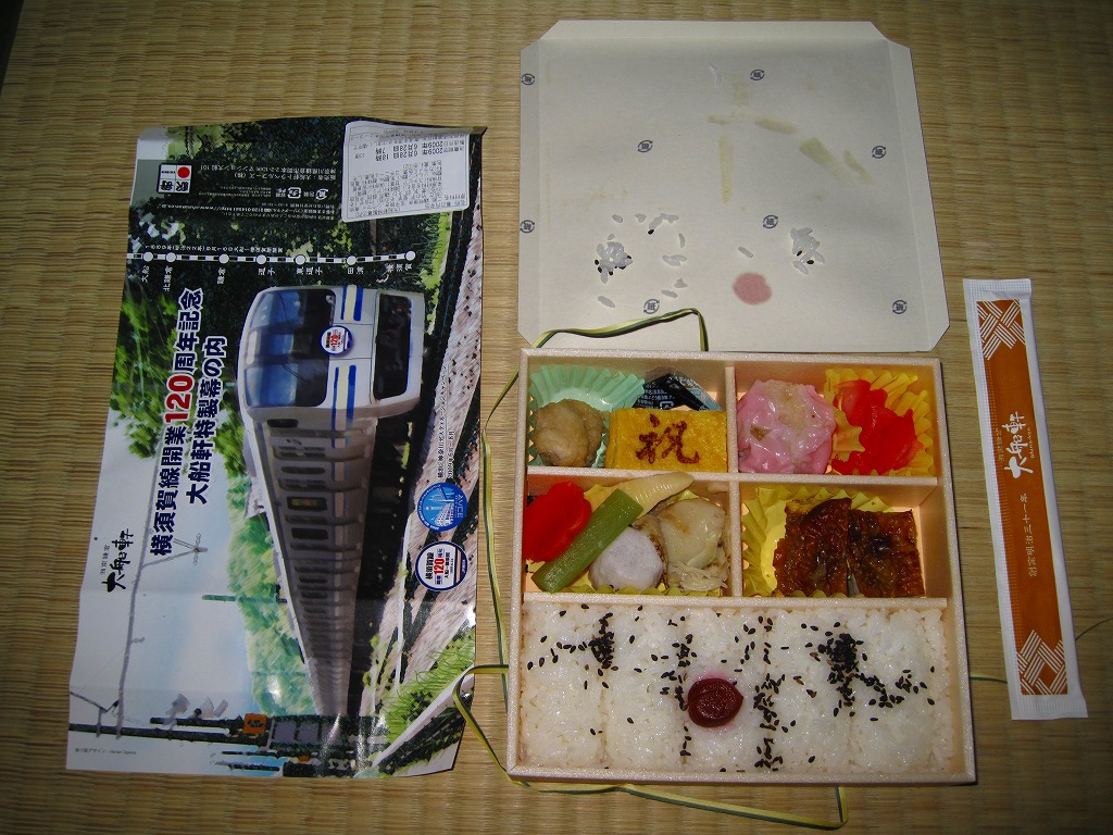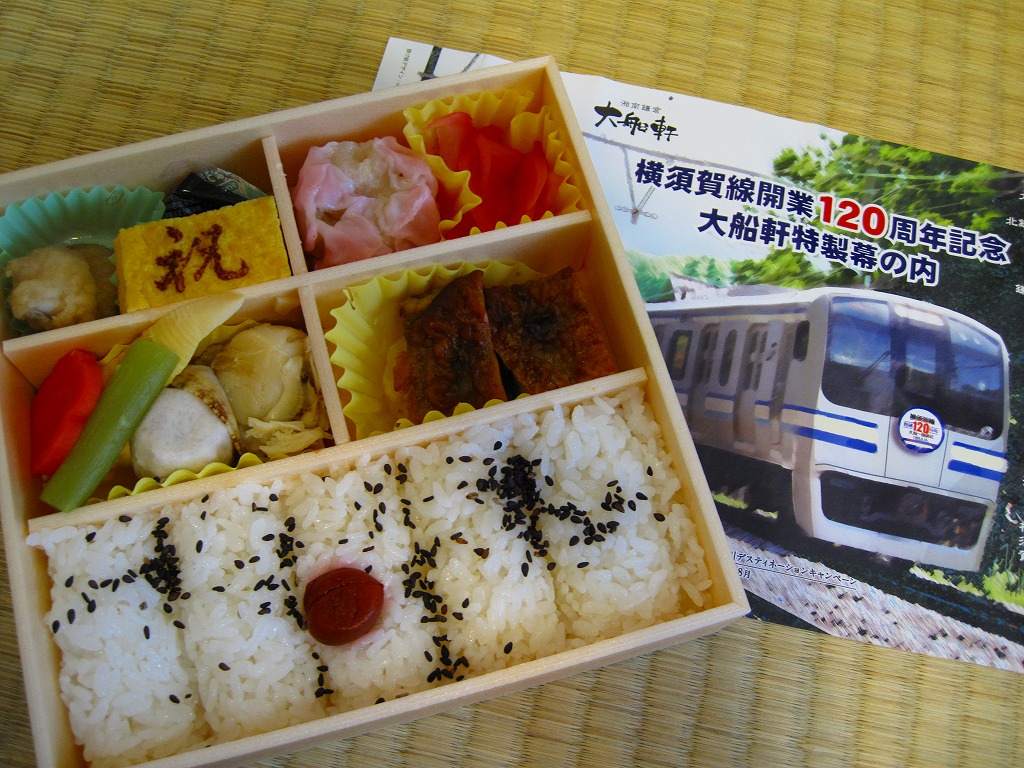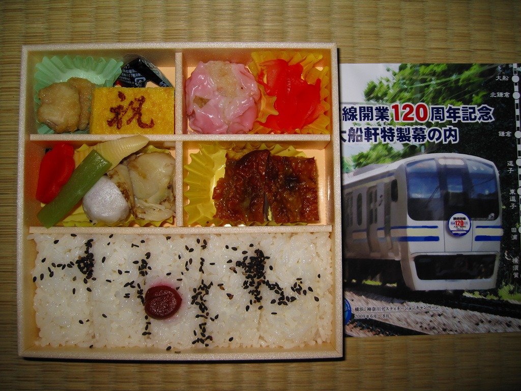 駅弁の名前のとおり、横須賀線の開業120周年を記念して、2009(平成21)年6月限りで販売された記念駅弁。浅く華奢(きゃしゃ)な正方形の容器に木目柄のボール紙でふたをして、横須賀線電車の加工写真かイラストかを印刷した掛紙を巻いて、ひもで十時にしばる。中身は日の丸俵飯にカレー風味の鶏照焼、ホタテやサトイモなどの煮物、ピンク色のしゅうまいと赤い漬物、「祝」焼き印の玉子焼など。いつもながらチープな大船駅の記念駅弁だけど、価格と分量と風味に不満は出ないし、掛紙の品質も良かった。