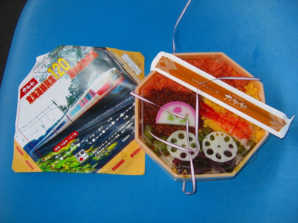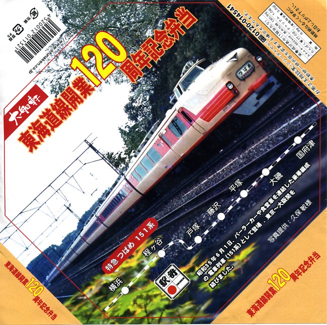 名前のとおりの記念駅弁。横浜・国府津間の開業120周年を記念して、2007(平成19)年7月11日から24日までを3期に分け、同じ名前と価格で掛紙を替えて販売した。これは15日から19日まで販売の第2弾で、1960(昭和35)年当時に大船駅を通過していた、パーラーカー付き特急「つばめ号」の写真を採用した。