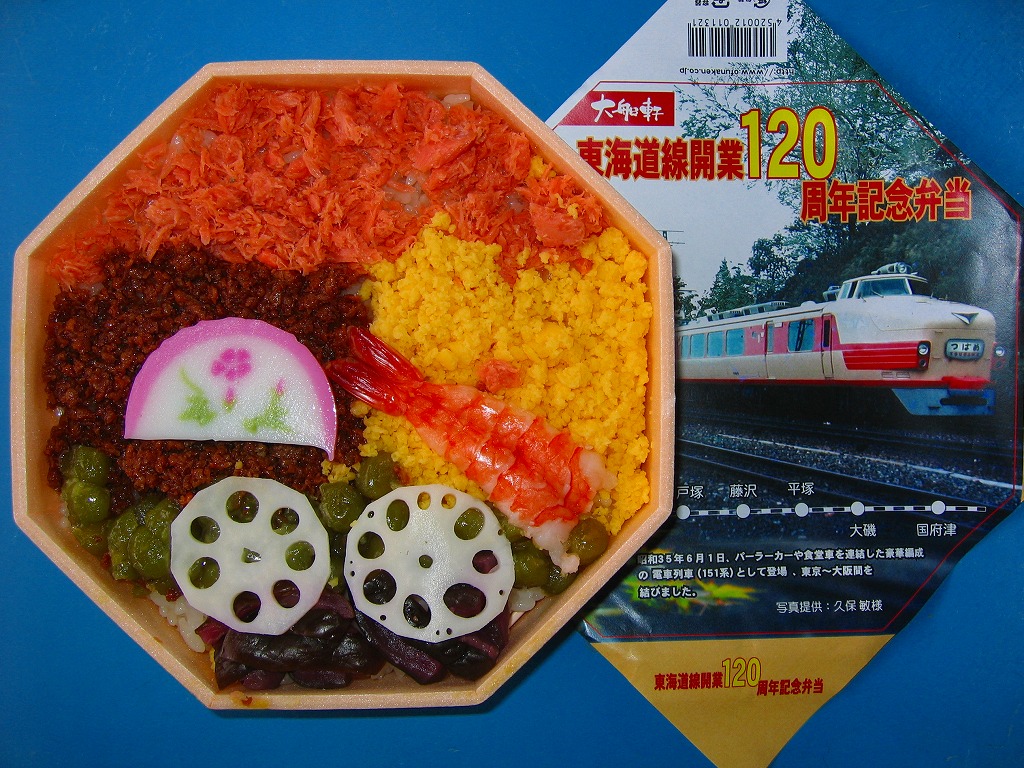下記の記念駅弁「東海道線開業120周年記念弁当」の第3弾で、1956(昭和31)年に運行を開始した寝台特急列車「あさかぜ号」の写真を採用した。掛紙だけのチェンジなので、中身や価格は当然に同一。