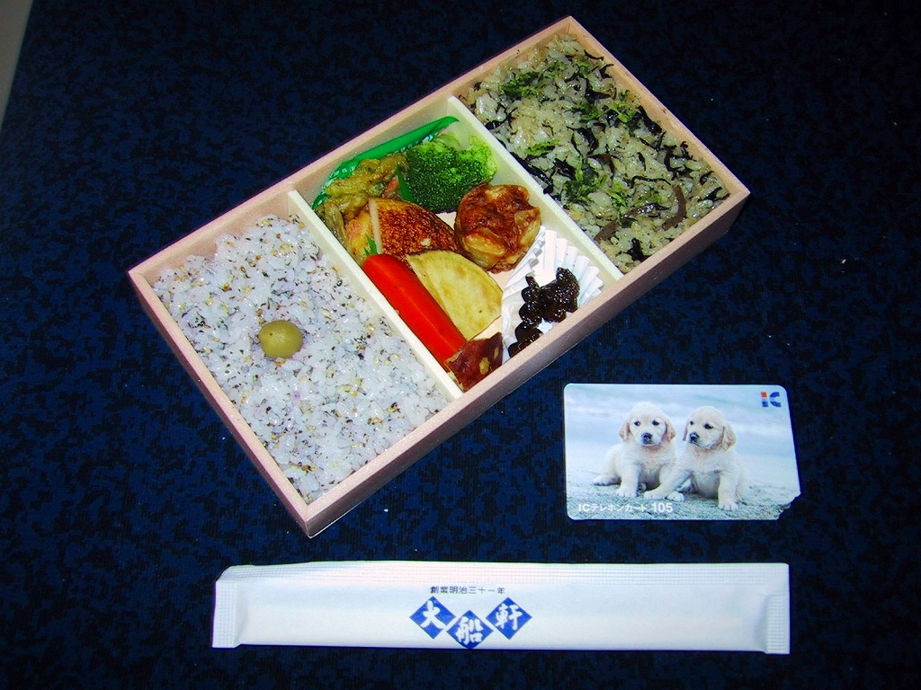 2001(平成13)年4月10日の駅弁の日に発売。長方形の容器を3分割し、左右に御飯を配置、中央におかずとして、ポーク焼売や薩摩芋に、薩摩揚やかき揚げや煮物類を入れるという、横浜駅弁「季節おこわ」にそっくりのつくり。当初は駅弁の日限定の駅弁として製作し、好評のため半年ほど駅売りが続けられていたらしい。現在は入手できない。