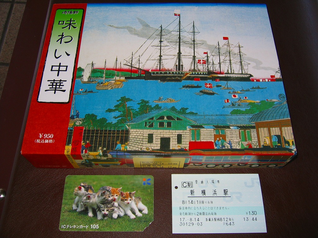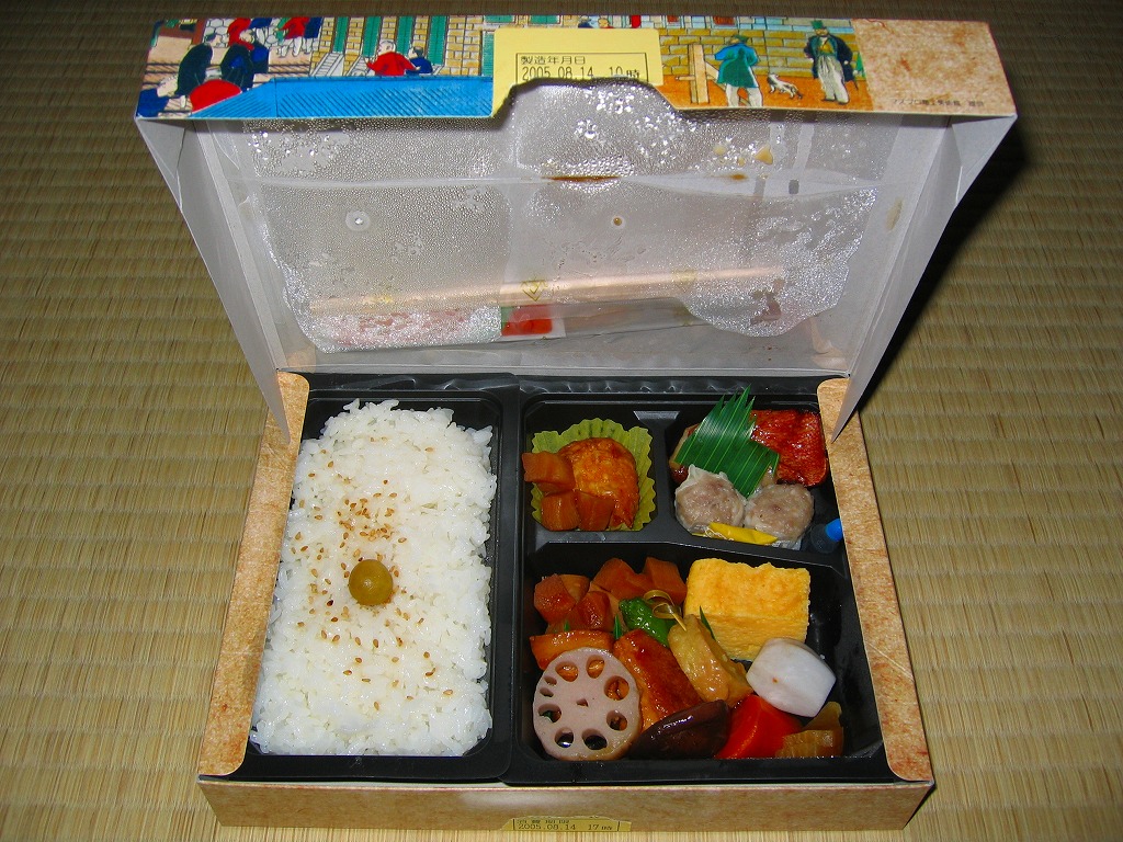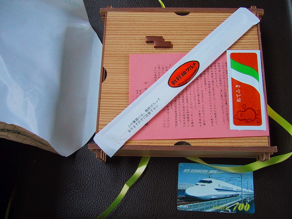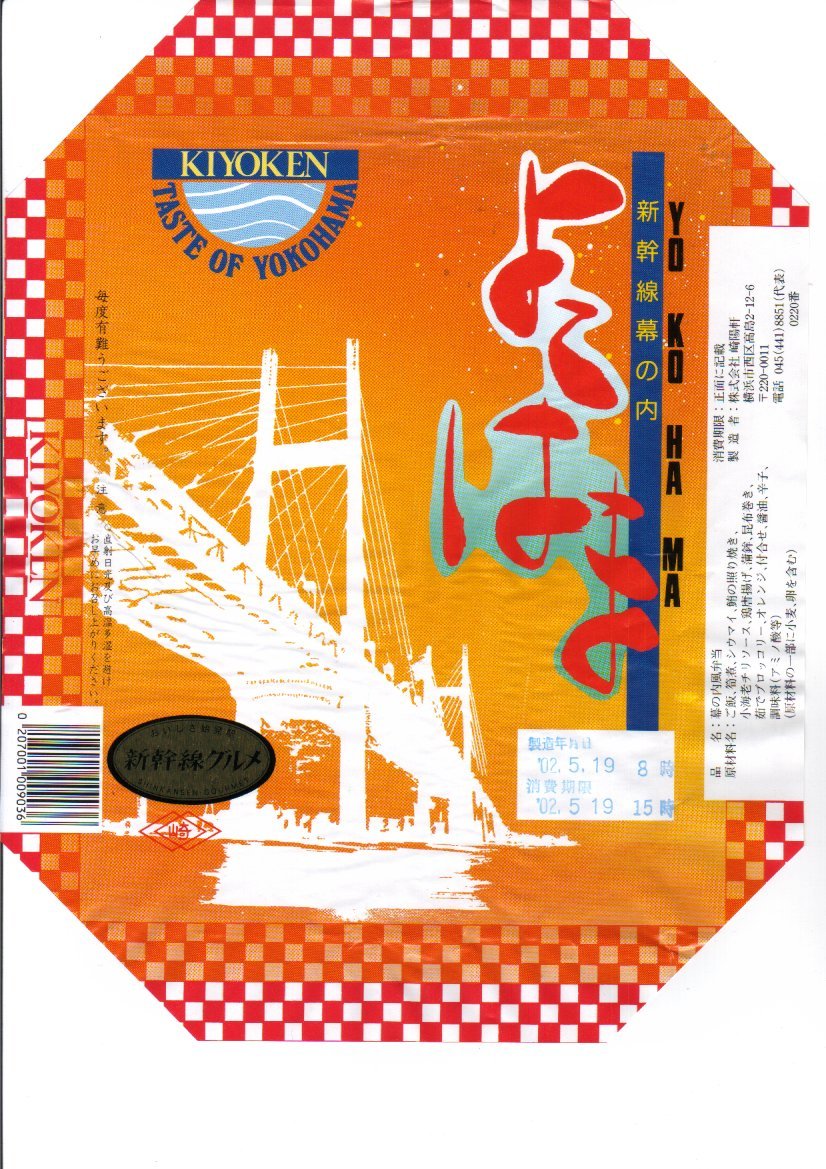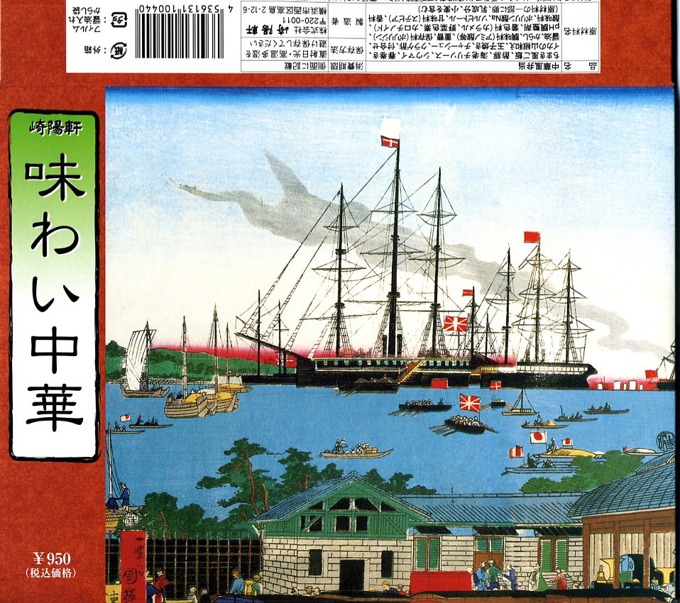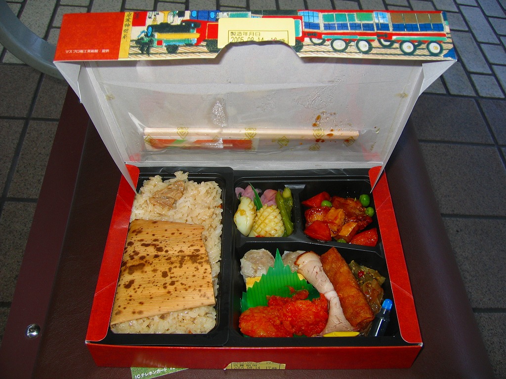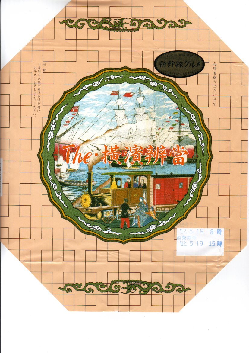 2005(平成17)年8月1日に発売した新横浜駅限定駅弁。横浜の蒸気車(鉄道)と黒船を描いた明治時代の錦絵を描くボール紙のパッケージを使用、中身はちまき風御飯にエビチリ、春巻、酢豚、イカ山椒和え、チャーシュー、クラゲ盛合せとシウマイなど。