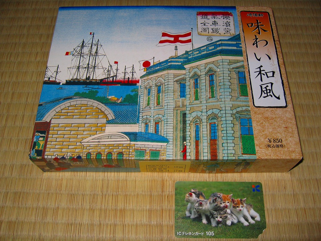 2005(平成17)年8月1日に発売した新横浜駅限定駅弁。横浜の蒸気車(鉄道)と黒船を描いた明治時代の錦絵を描くボール紙のパッケージを使用、中身は日の丸御飯に豚角煮、赤魚照焼、煮物各種、タケノコ角切り、玉子焼とシウマイなど。