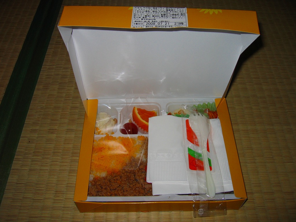2008(平成20)年7月19日から8月24日まで新横浜駅で販売された期間限定駅弁。15個入り以上のシウマイに付いてくる磁器の醤油入れ「ひょうちゃん」をキャラクターにしたイラストを描くボール紙製の専用紙箱を使用、白いトレーに詰めた中身は、鶏の親子そぼろ御飯、エビフライ2本、肉団子、スパゲティ、鶏唐揚、ポテトサラダ、フライドポテト、ミニトマト、オレンジ、シウマイまん。