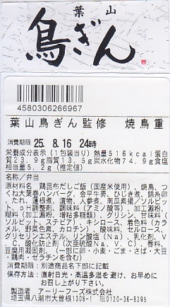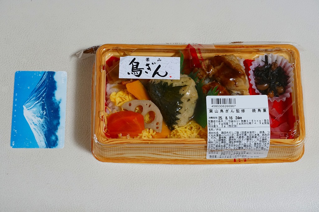 新横浜駅の駅弁売り場で買えたお弁当。食品表示での商品名は「葉山鳥ぎん監修焼鳥重」。神奈川県の三浦半島の葉山町や横須賀市で営業する釜飯と焼鳥の食堂が監修して県内の新幹線駅で売られる駅弁のようなものと思ったら、調製元は埼玉県であり、都内のスーパーなどで売られる弁当であるらしい。食堂は調製元のグループ会社という関係か。