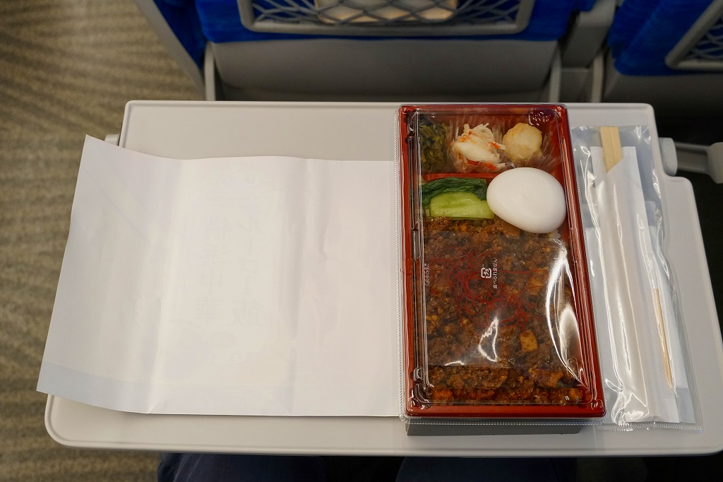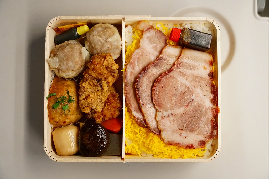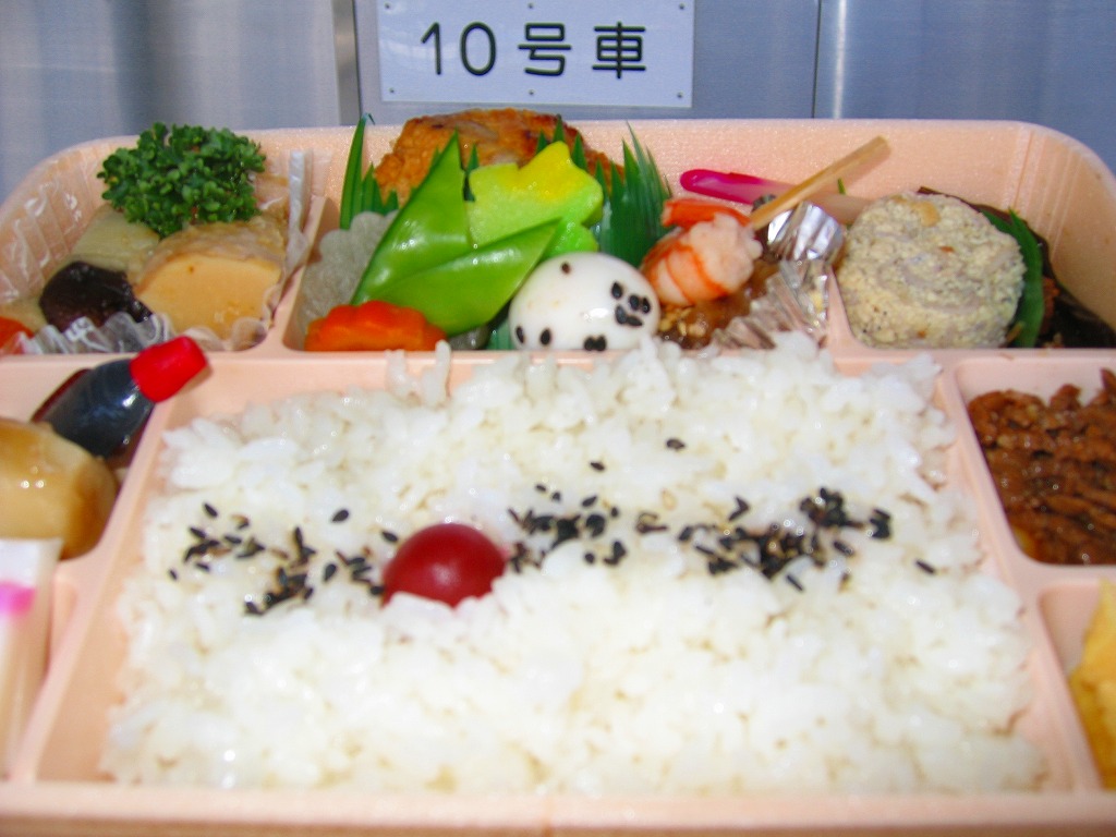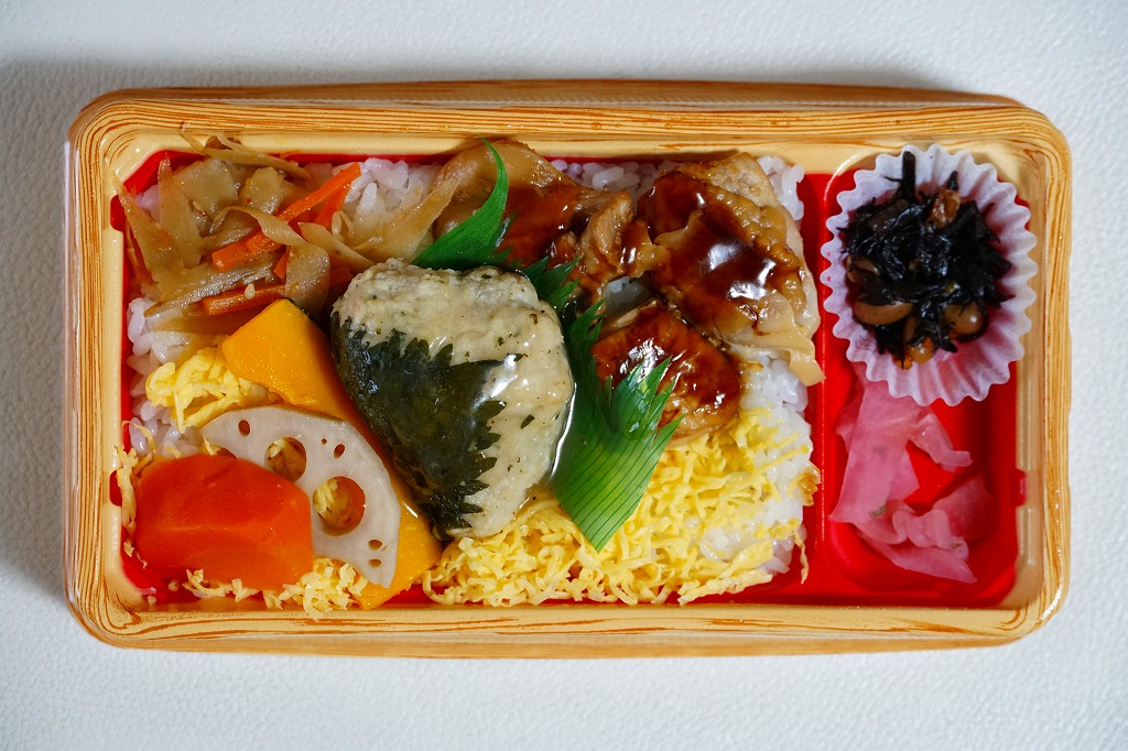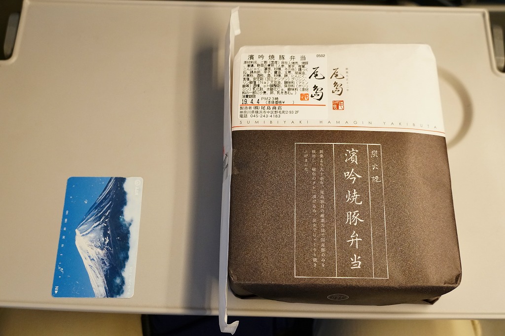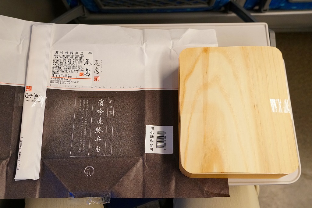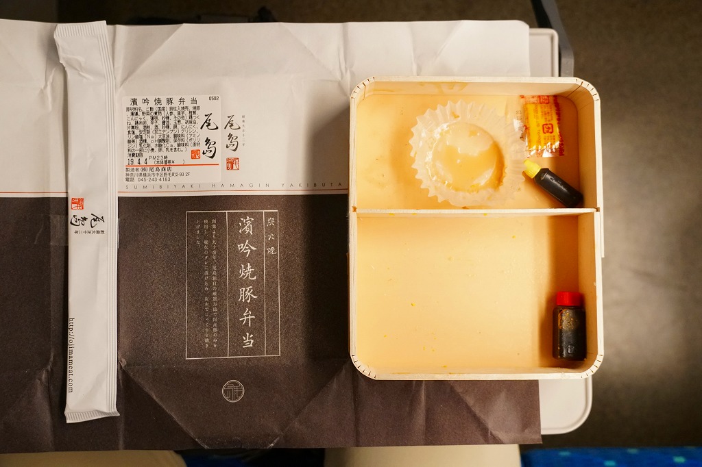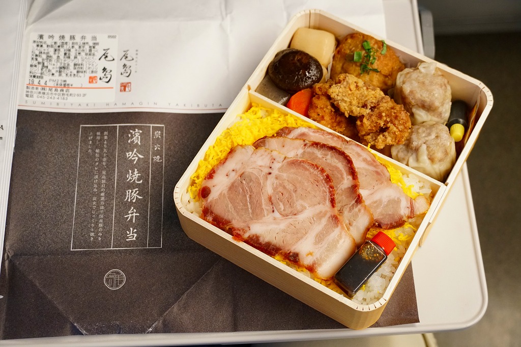 2009(平成21)年までには東京駅や羽田空港で登場していた模様。黒いプラ製トレーの容器に透明なふたをして、商品名と書いたオレンジ色の掛紙を巻く。中身は白御飯の上を「和豚もちぶた」の照り煮なる豚肉で覆い、タマネギ煮とシシトウ、玉子焼と大根桜漬を添えるもの。内容のシンプルさと分量が心地良く、しかし冷めた状態で食べる味ではないとも思う。