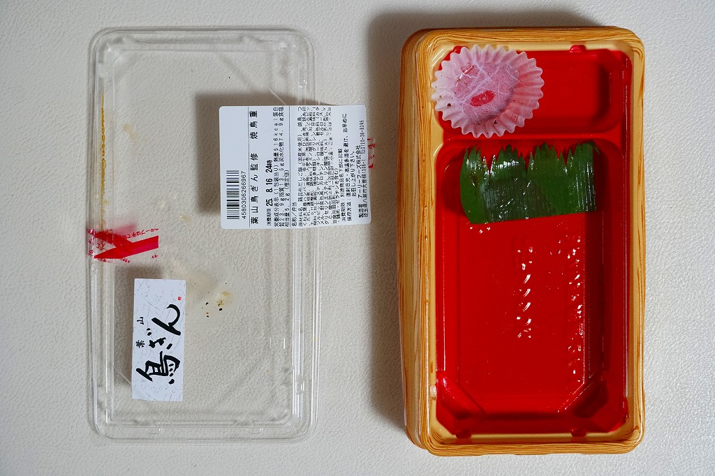 デパートの地下食品売り場やスーパーの惣菜売り場で見かける体裁で、ふたが透明なプラ容器に鶏昆布だし御飯を詰め、焼き鳥と鶏つくねに煮物や錦糸卵で覆い、ひじきと大根漬を添える。食べても惣菜の鳥弁当。