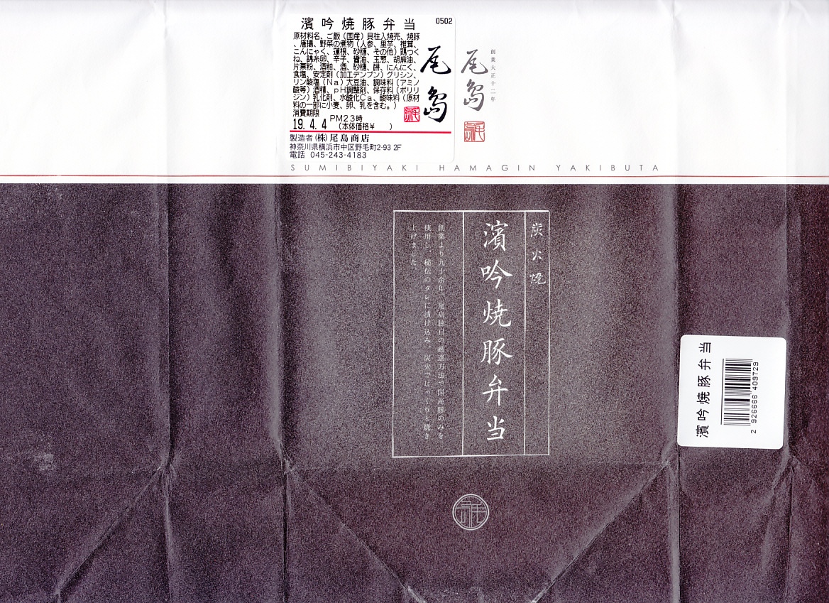 新横浜駅で崎陽軒の横浜駅弁やJRCPの東京駅弁を売る売店で、2019(平成31)年までに取り扱いを開始。横浜市野毛で1923(大正12)年に創業した老舗の精肉店「尾島商店」が、高島屋横浜店のデパ地下などで2016(平成28)年頃から売るお弁当。底のみボール紙の経木折を、弁当名と宣伝文をささやかに書いた落ち着きのある包装紙で包む。白飯を錦糸卵で覆い、焼豚の薄切りでさらに覆い、焼売2個と鶏唐揚と鶏つくねと煮物を添えた、上品でも力強くボリュームある内容。