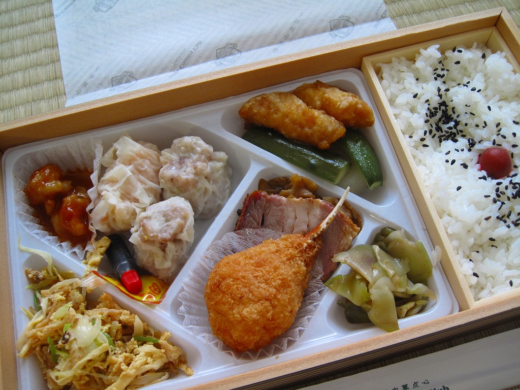 新横浜駅ビルの食品フロアで販売されていたお弁当。長方形のしっかりした容器に、「横浜中華点心」や「Isogo Country Club Yokohama」の文字を記した包装紙を巻く。中身は内蔵容器に収まる日の丸御飯と、白いトレーに収まるシュウマイ、海老包み蒸し、カニ爪フライ、干し貝柱の卵炒め、ごぼうとれんこんの炒め物、白身魚マリネ、エビチリ、チャーシュー、大根とキュウリの甘酢、ザーサイ。