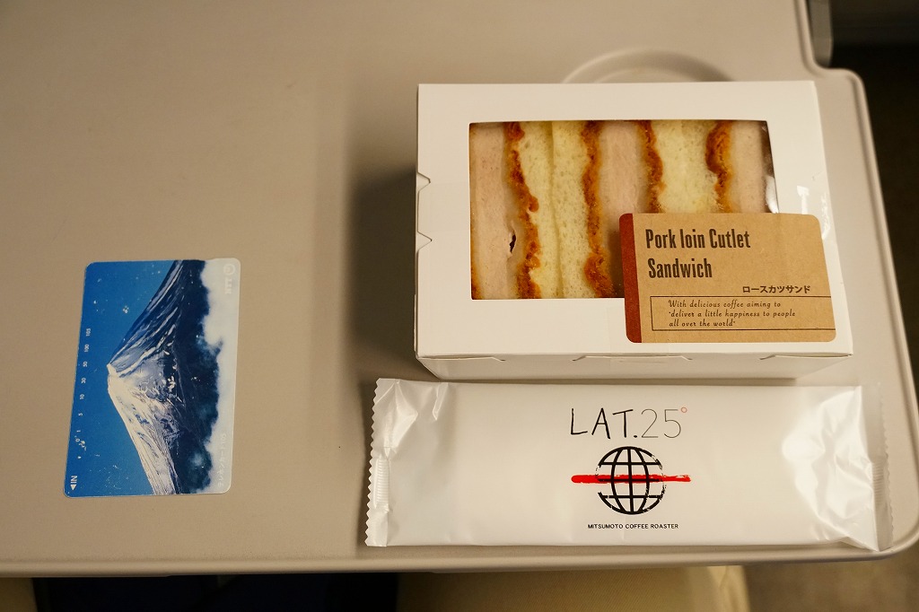 新横浜駅の新幹線改札内の待合室で、2017(平成29)年5月31日にリニューアルオープンした店舗「LAT.25」で売られる箱入りサンドイッチ。窓がある白い紙箱に、端整なロースカツを軽めのソース漬けにして、耳なし食パンに挟んだものを3切れ収めた。商品が機能的あるいは売り場的にサンドイッチ駅弁と同じ存在であることと、横浜創業の三本コーヒーが空港と東海道新幹線駅に展開する店舗であることから、ここに収蔵。商品の調製元そのものは、東京都江戸川区のホールセールベーカリー。