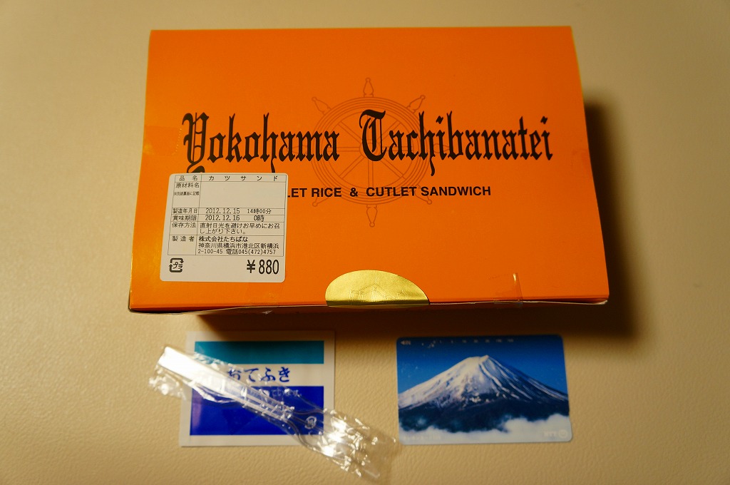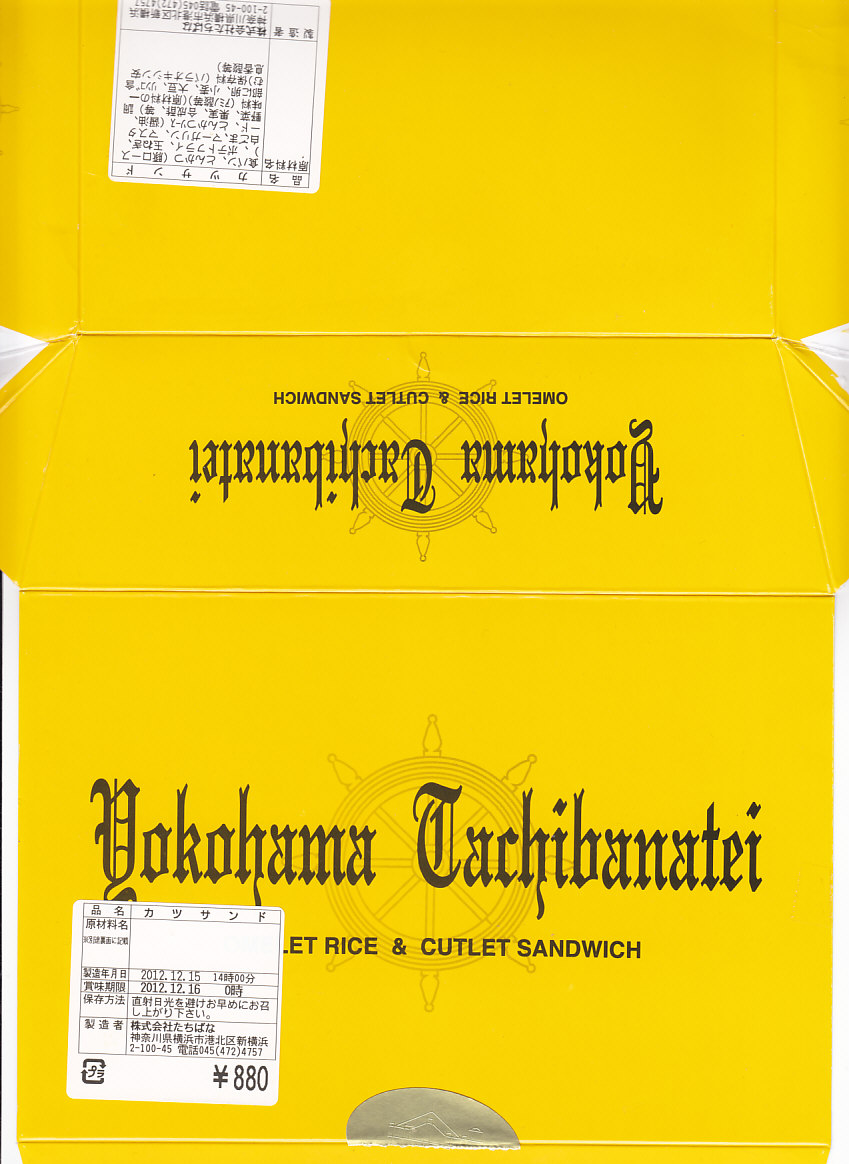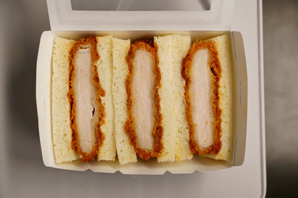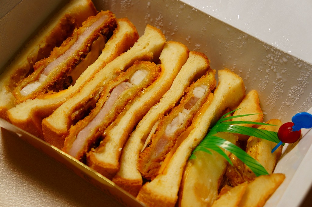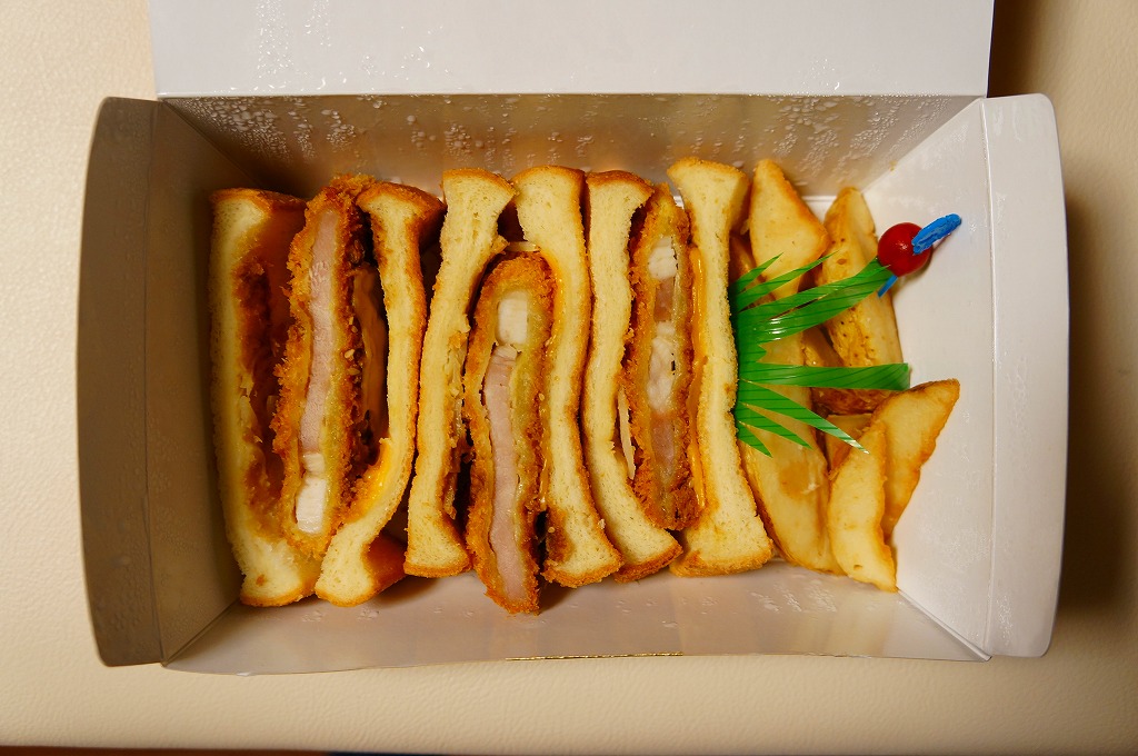 2012(平成24)年頃から新横浜駅構内、厳密には駅ビルあるいは交通広場の一角での台売りを始めた商品のひとつ。オレンジ色で大きめな専用紙箱に、トーストした食パンにチーズやタマネギやロースカツを挟んだカツサンドを3切れと、ポテトフライを直に詰める。バターのような脂身とトーストされた食パンで個性がある。同じ調製元のトンカツ弁当より高価な価格設定と、上記3点をまとめて同じ場所で購入したのに、体裁も内容も風味も同じ業者の製造販売とは思えないような三者三様が、興味深かった。2023年に新横浜駅の店舗が閉店したようで、今は駅では買えない。