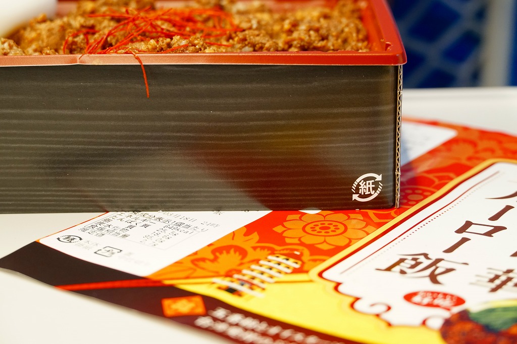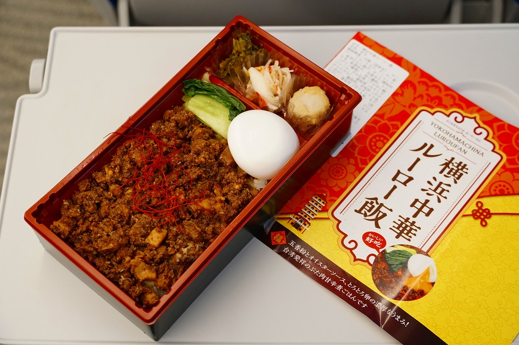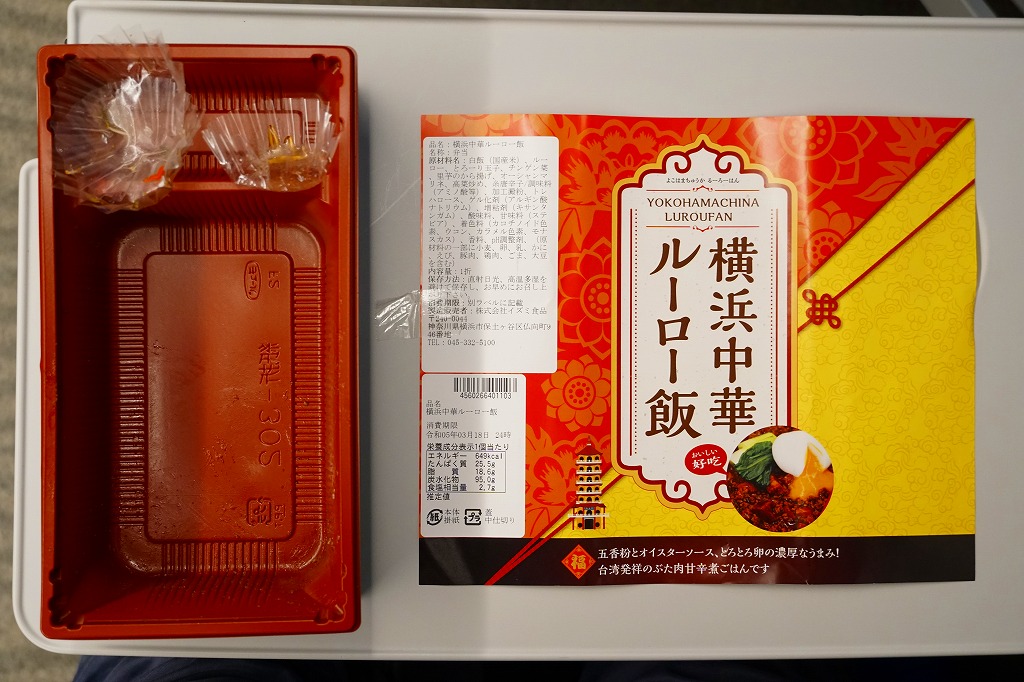 新横浜駅では2023(令和5)年の春までに発売か。調製元は2010年前後に横浜駅や新横浜駅あるいは東京都内で売られた「横濱牛めし」などで見た名前。駅では久々に出会えたと思う。つくりは新横浜駅で買える崎陽軒やジェイアール東海パッセンジャーズなどの駅弁と同じ感じで、商品名を描いた掛紙を巻いた長方形のプラ容器に、白飯を敷いて豚バラ肉のミンチ「ルーロー」で覆い、半熟卵のようなもの、チンゲンサイ、サトイモの唐揚げ、キャベツのマリネ、高菜炒めを添える。五香粉などで台湾料理の香り豊かで、お肉もたっぷりで、駅弁屋の弁当に負けず常温でおいしい豚丼。年内で終売か。