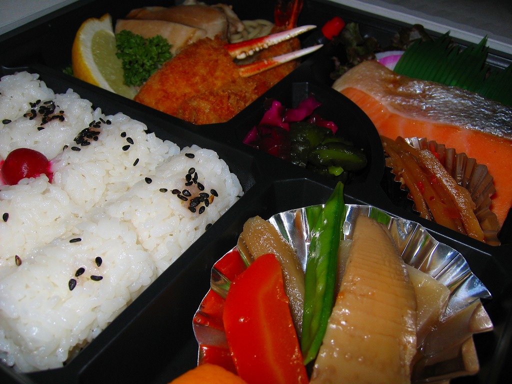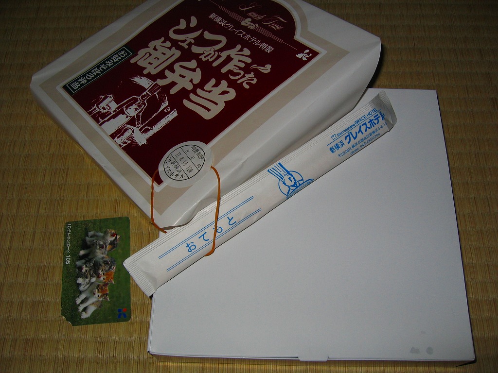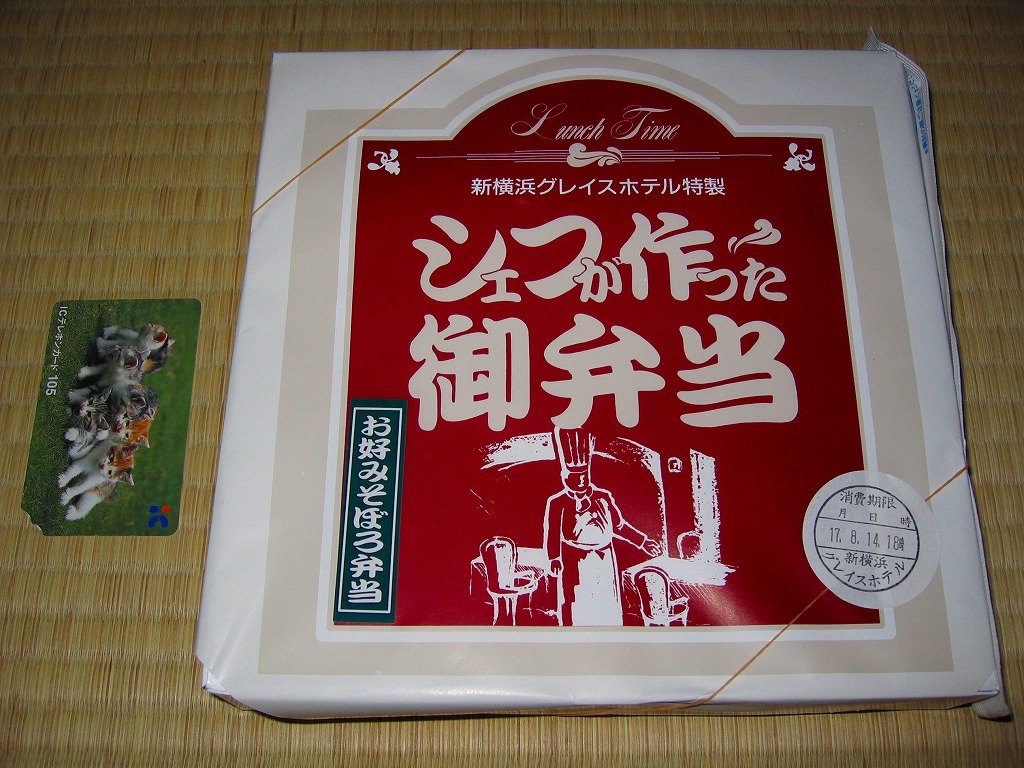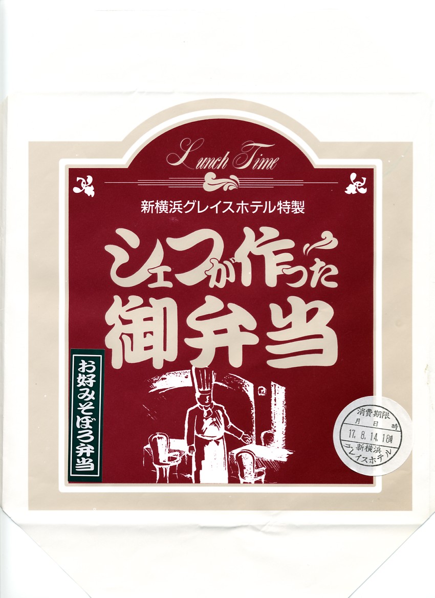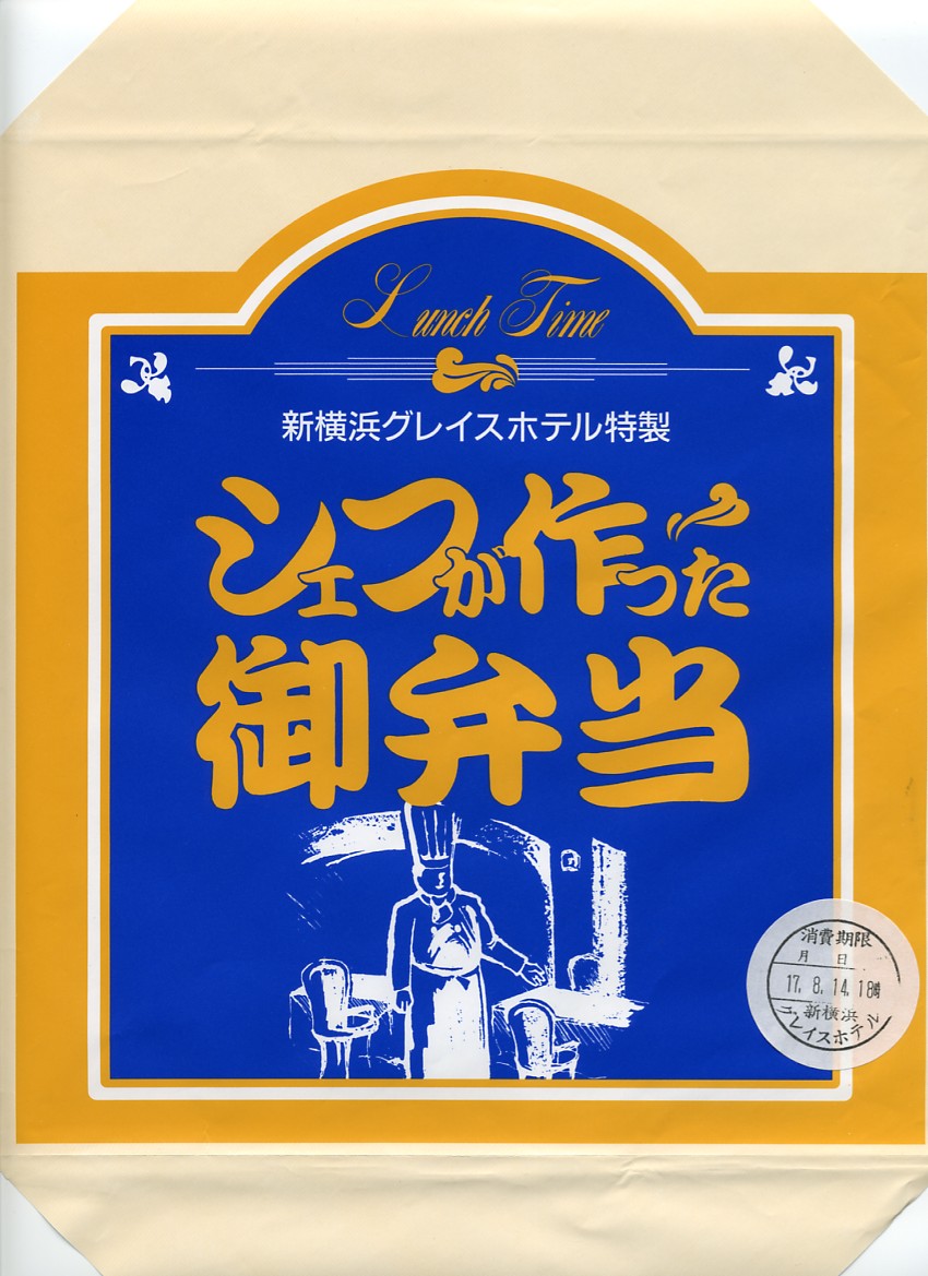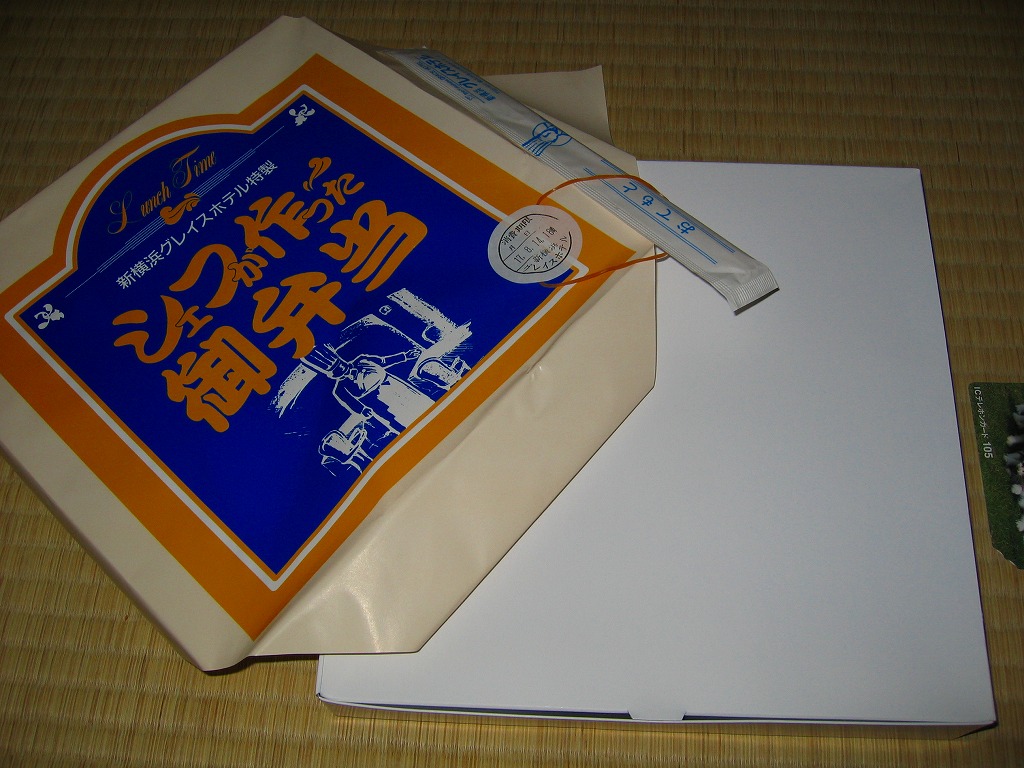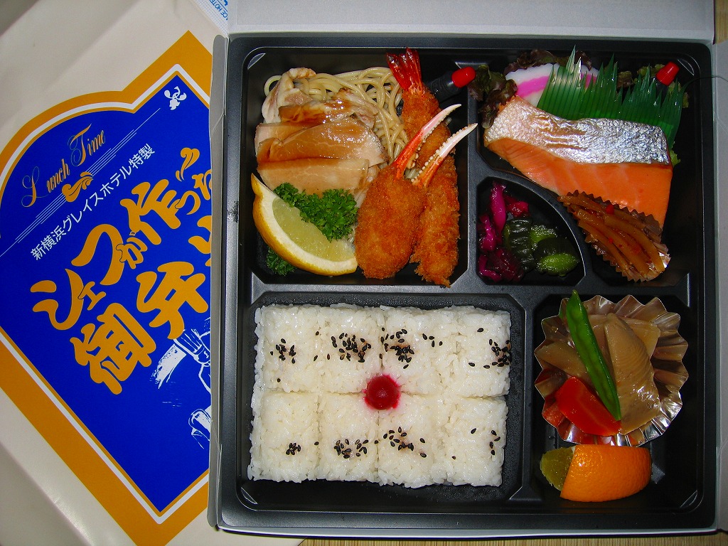 新横浜の駅前ホテルが調製する、知る人ぞ知る隠れた新横浜駅弁の元祖。事務的に白い大きな正方形のボール紙箱を、青バージョンの大きな掛紙で包み、事務用輪ゴムで留めて調製印シールを貼る。中身は俵型日の丸御飯、蒲鉾と焼鮭と煮物、海老フライとカニ爪フライにハムとパスタなどの、和洋折衷幕の内駅弁。