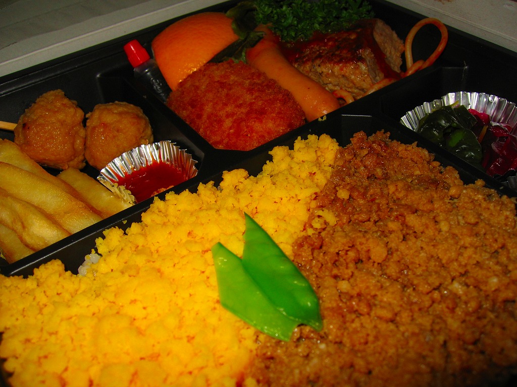 新横浜の駅前ホテルが調製する、知る人ぞ知る隠れた新横浜駅弁で、さらにマイナーな別バージョン。事務的に白い正方形のボール紙箱を赤バージョンの掛紙で包む。中身は玉子そぼろと豚そぼろの御飯に、ステーキのような鶏唐揚、ウインナー、フライドポテト、クリームコロッケなど。ホテルのブッフェな雰囲気と風味を感じる。