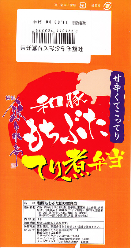 和豚もちぶたとは、仙台駅でも駅弁になったことがある、群馬県渋川市のグローバルピッグファームが持つ銘柄豚で、2011年8月現在で北海道から佐賀県まで81農場で生産されているという。この駅弁の調製元はJRCPではなく、「牛めし」で駅や空港へ乗り込んできたイズミ食品。一時は横浜駅の中や近くでも同社の弁当が買えたが、いつしか売店ごと消滅し、その後にJRCPとの取引ができたようで、このようにJRCPの駅弁売店で買えるようになっていた。201年までの販売か。