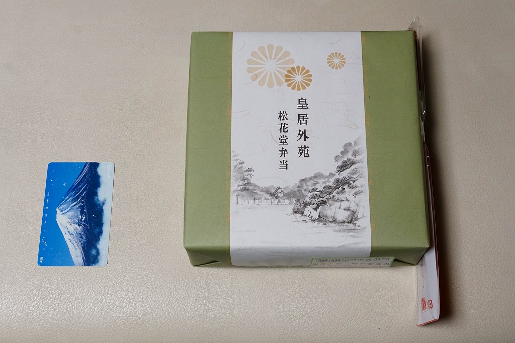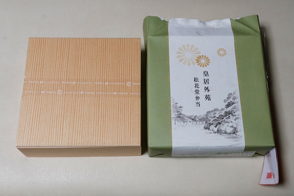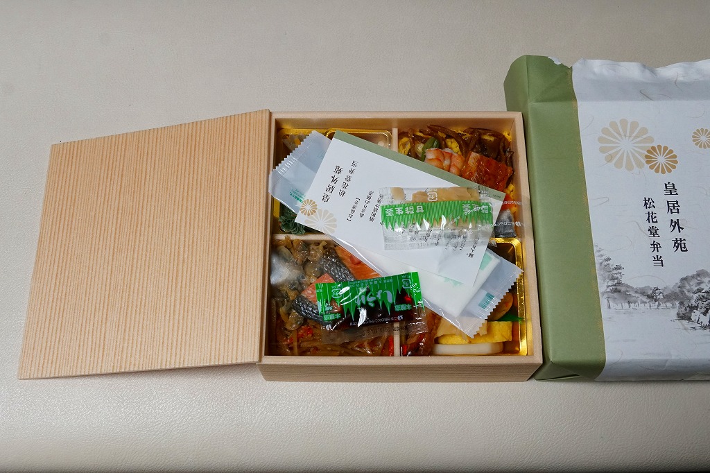 2015(平成27)年から羽田空港で見られるようになった「皇居外苑」ブランドの土産物群の弁当版。新横浜駅で購入したが、東海道新幹線の東京駅や品川駅でも売られているのではないかと思う。松花堂と名乗るので容器の4区画に、ちらしずし、鮭とアサリときんぴらごぼうの御飯、鶏照焼や玉子焼や煮物、イクラ和えや牛肉和えや漬物など。そんなちょっとごちゃごちゃした中身を、羽田空港の土産物と同じく、皇室の菊の御紋に似た菊紋をいくつも描いた包装紙で包んでいた。
