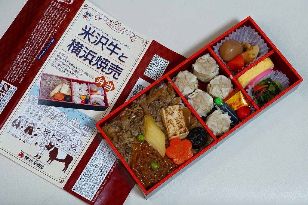 2024(令和6)年12月2日に新横浜駅で発売。調製元は山形県のJR米沢駅の駅弁屋で、販売元は東海道新幹線の各駅で駅弁を販売するJR東海リテイリング・プラスであるが、この弁当は米沢でも東名阪の各地でもなく、新横浜駅に限り売られる。中身は掛紙の写真のとおり、やや細長い容器の、半分弱に白飯を詰めて牛すき焼きで覆い、残る半分に焼売5個と醤油と辛子とさくらんぼ、続いて山形の芋煮を思わせる煮物3点と、青菜の醤油漬と玉子焼とかまぼこ。