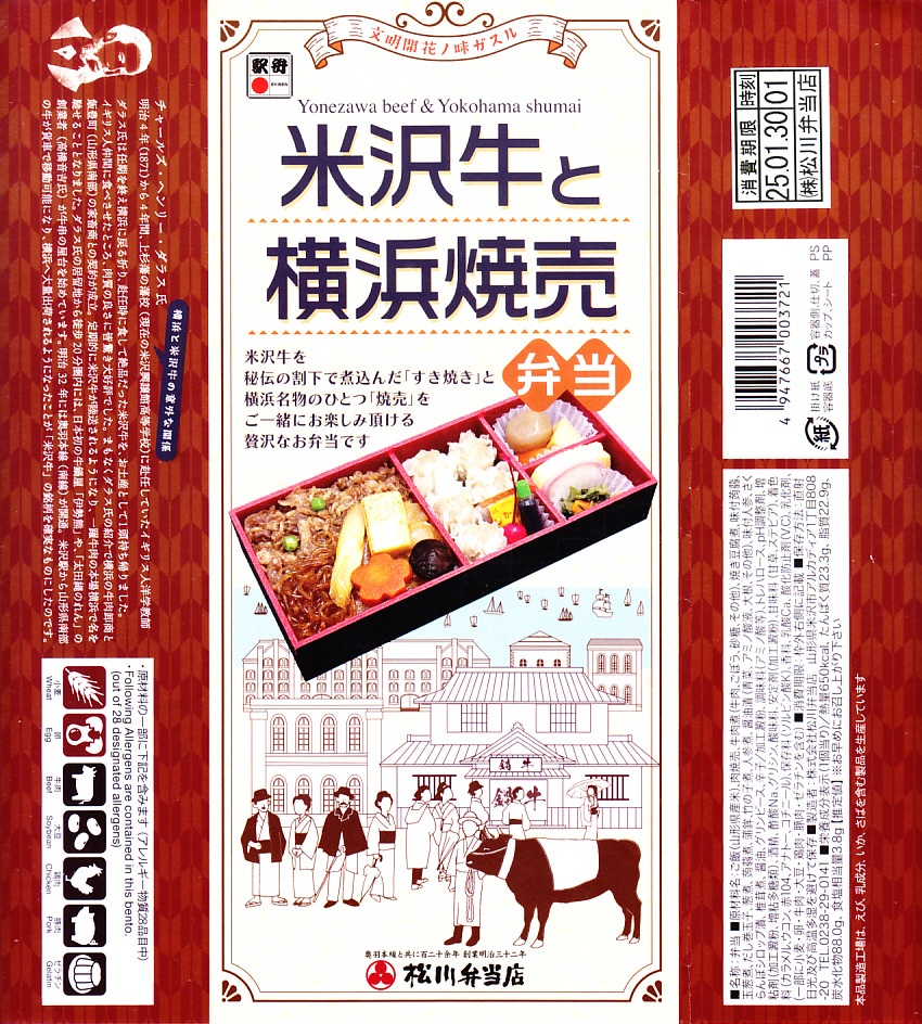 米沢の駅弁屋が東北や関東や関西へ幅広く出荷する牛肉駅弁に焼売を組み込んで横浜を名乗ったように見えて、そんな単純なコンセプトでないことが掛紙の小さな文字に読み取れる。明治4年(1871年)に米沢へ教師として赴任した英国人が、1875(明治8)年に任期を終えて横浜の居留地へ戻る折り、お土産として持ち帰った牛が横浜の外国人や牛肉卸や牛鍋屋で評判となり、今の米沢牛の銘柄を確実なものにしたという。今に名物であるものとしては昭和生まれの横浜焼売より古い歴史で横浜とつながる。これならば崎陽軒のシウマイ弁当のパクリと見られず言われずに、この駅で販売が定着しそうに思えた。