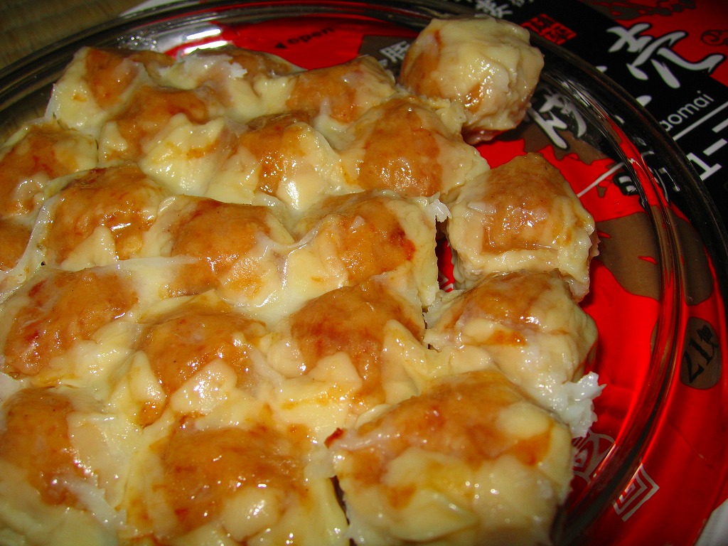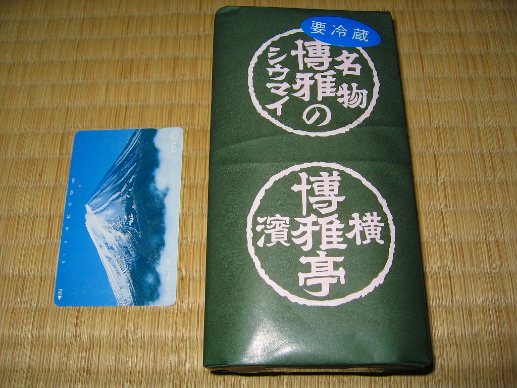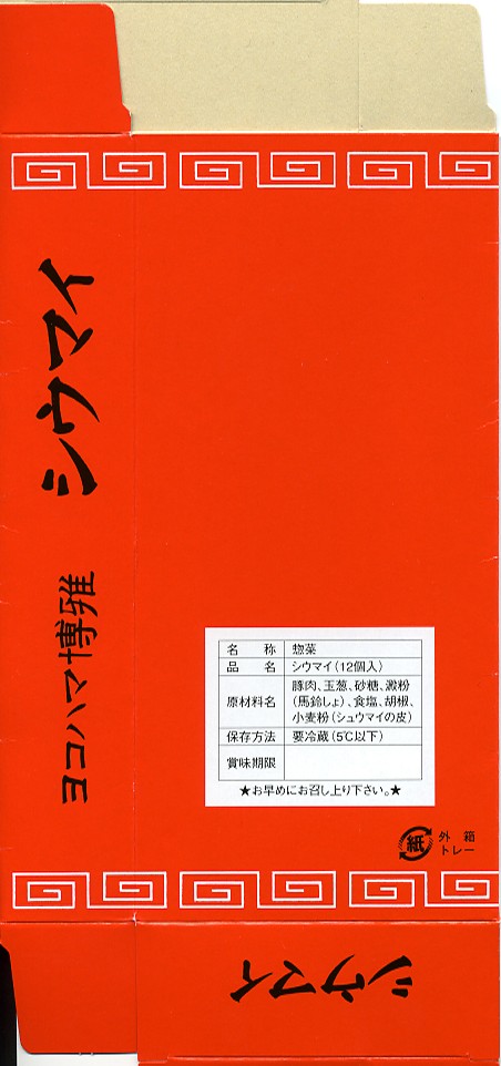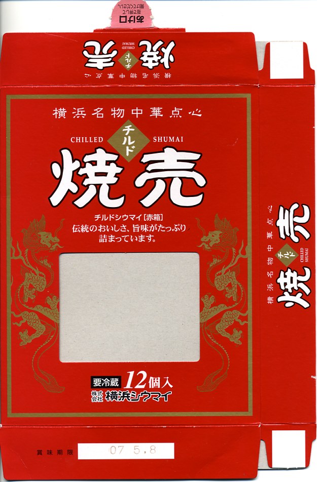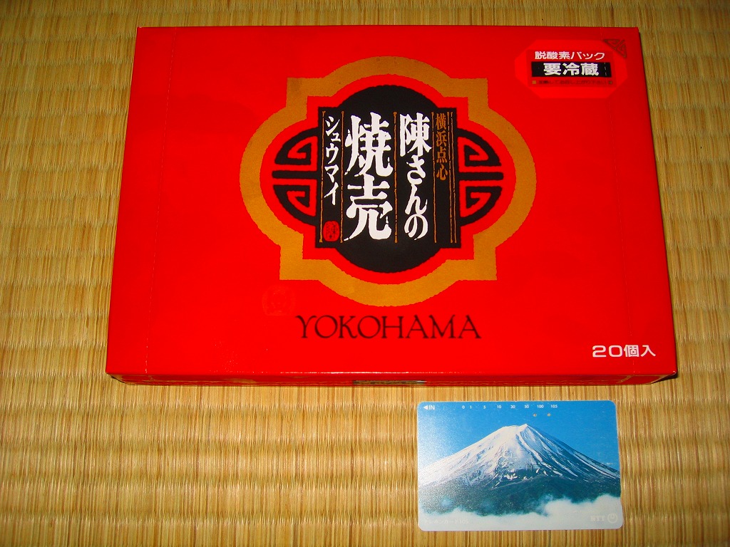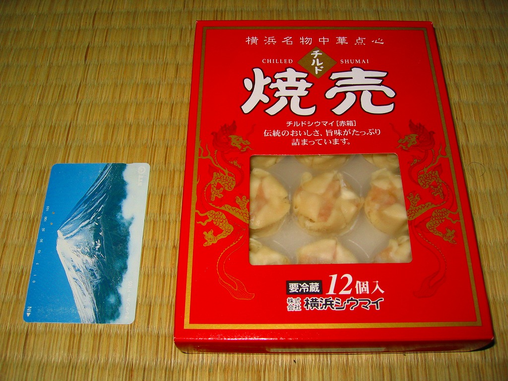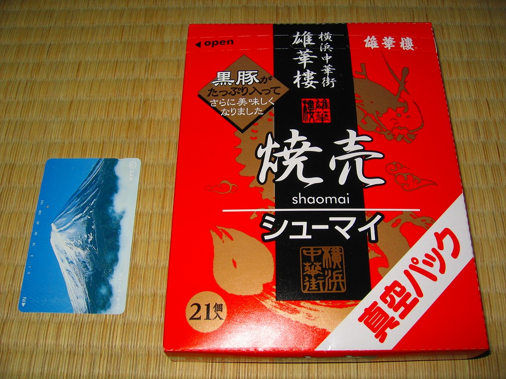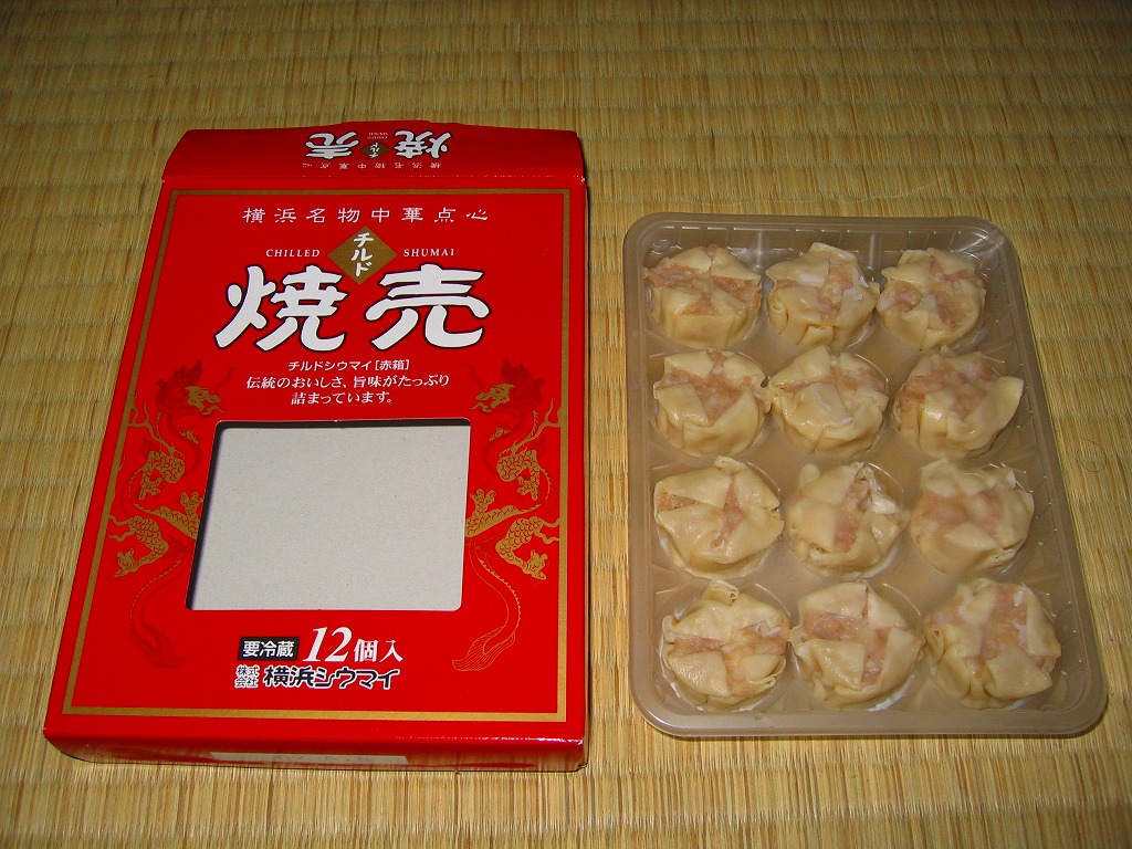 高島屋横浜店で見つけた、横浜名物シウマイの崎陽軒でないパッケージ。赤い紙箱の中に12個の焼売が入って525円は崎陽軒より単価が高いが、サイズは心持ち大きめで、味はまったく異なり豚肉の風味が支配的な肉焼売。富山のますのすしと同様、横浜のシウマイも様々な業者が製品を出しているので、これから集めていきたい。