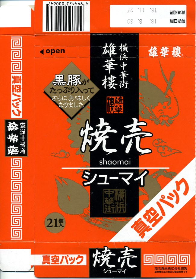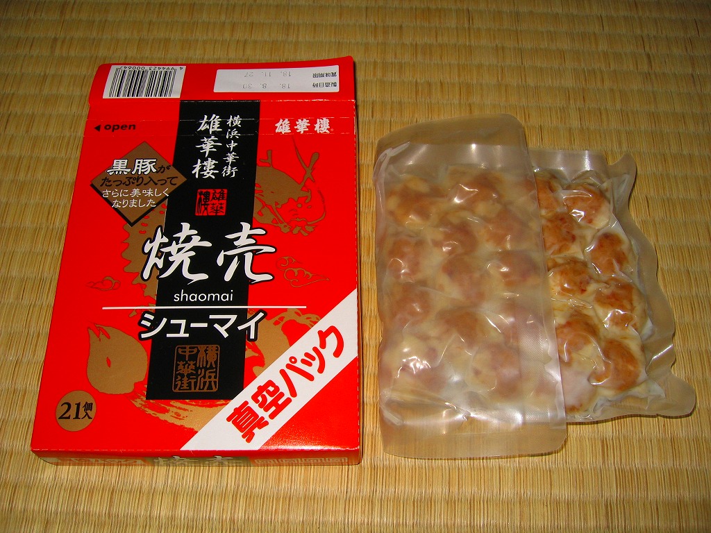 高速道路のサービスエリアや一部空港で手広く販売されている雄華樓ブランドの焼売のうち、通常版焼売単品の真空パック商品。写真のとおり、皮が見た目で一体化してしまった焼売が21個、透明な袋で真空パックになって、赤い紙箱に収められる。風味は駅弁で有名な崎陽軒とは違い、豚肉の味が勝る印象。3か月間保存可能。