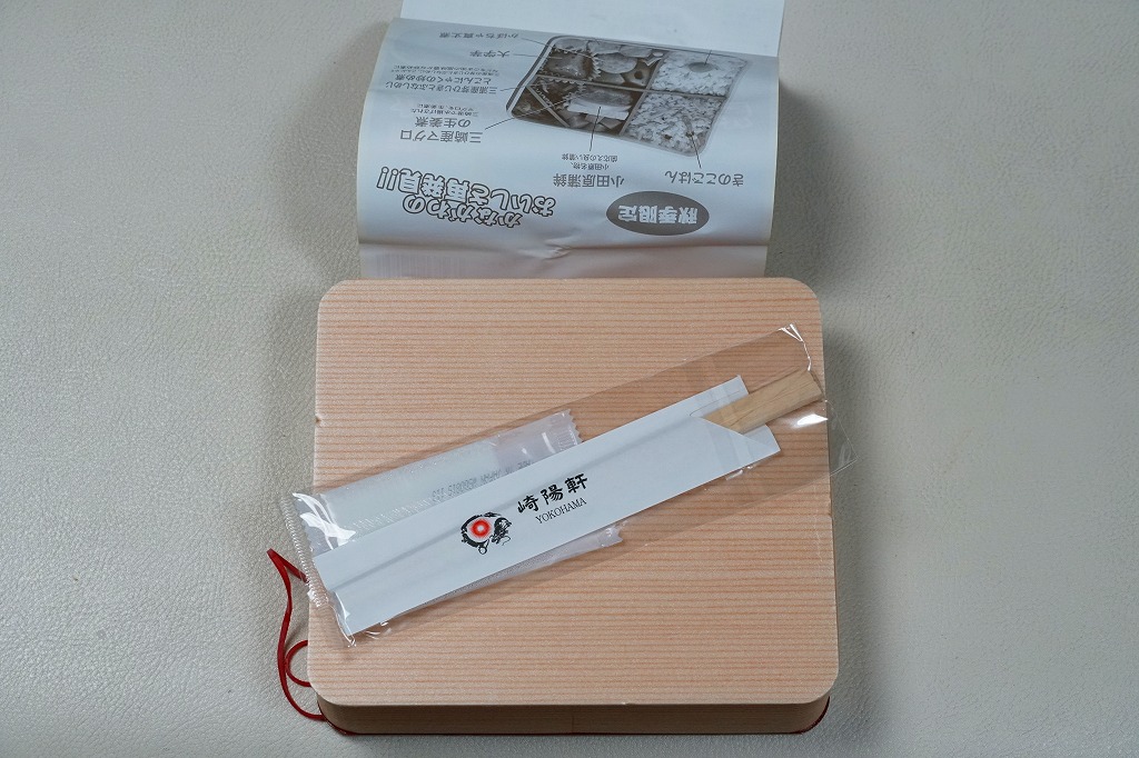 この掛紙のデザイン、というより弁当の外観そのものが、観光キャンペーンの電車内中吊りポスターその他の広告に掲載されたものと同じである。その広告にはこんな弁当は実在しない旨の注記が付いていたので、無許可ではないと思うがお茶目にも駅弁屋が実在の弁当にしてしまった模様。崎陽軒が横浜ではなく神奈川を前面に出した商品を売ることも、珍しいと思う。