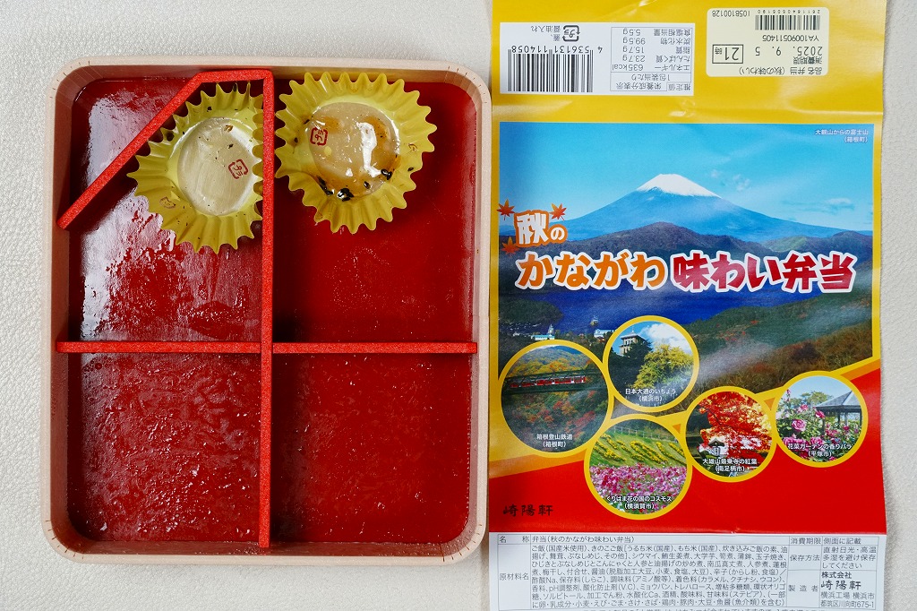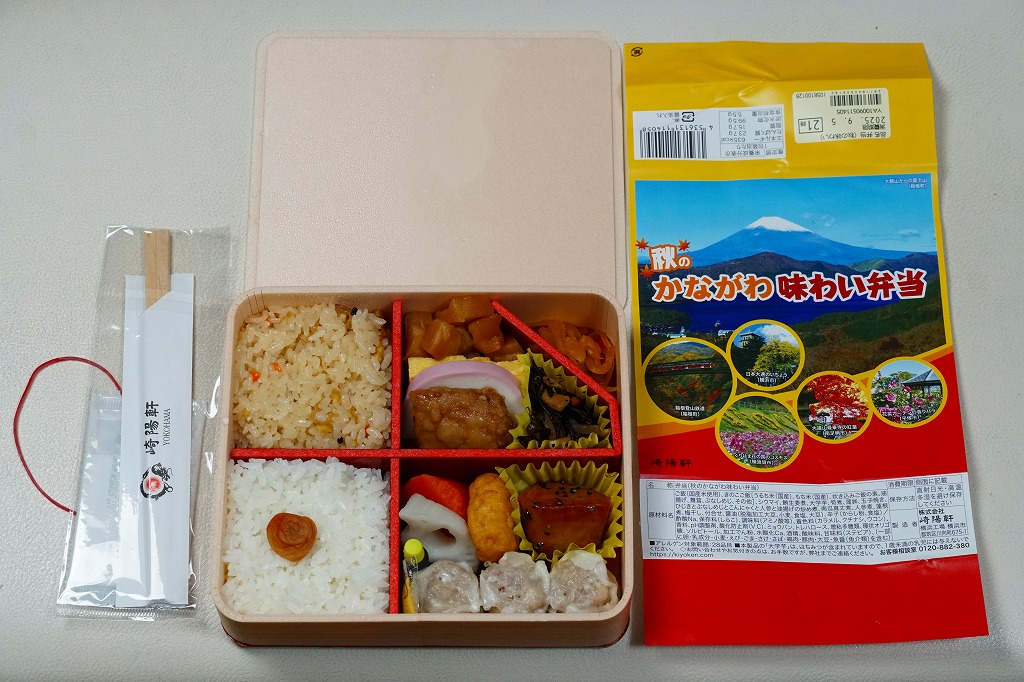 2008(平成20)年に発売された「かながわ味わい弁当」の、17シーズン目の「秋」版で、2024(令和6)年9月1日から11月30日までの販売で、やはり神奈川県とのタイアップ企画。加えて10月からのJR東日本の駅弁キャンペーン「駅弁味の陣2024」へエントリー。13年前から変わらない形の、秋の風景でできている掛紙は、前年とまったく同じ絵柄。
