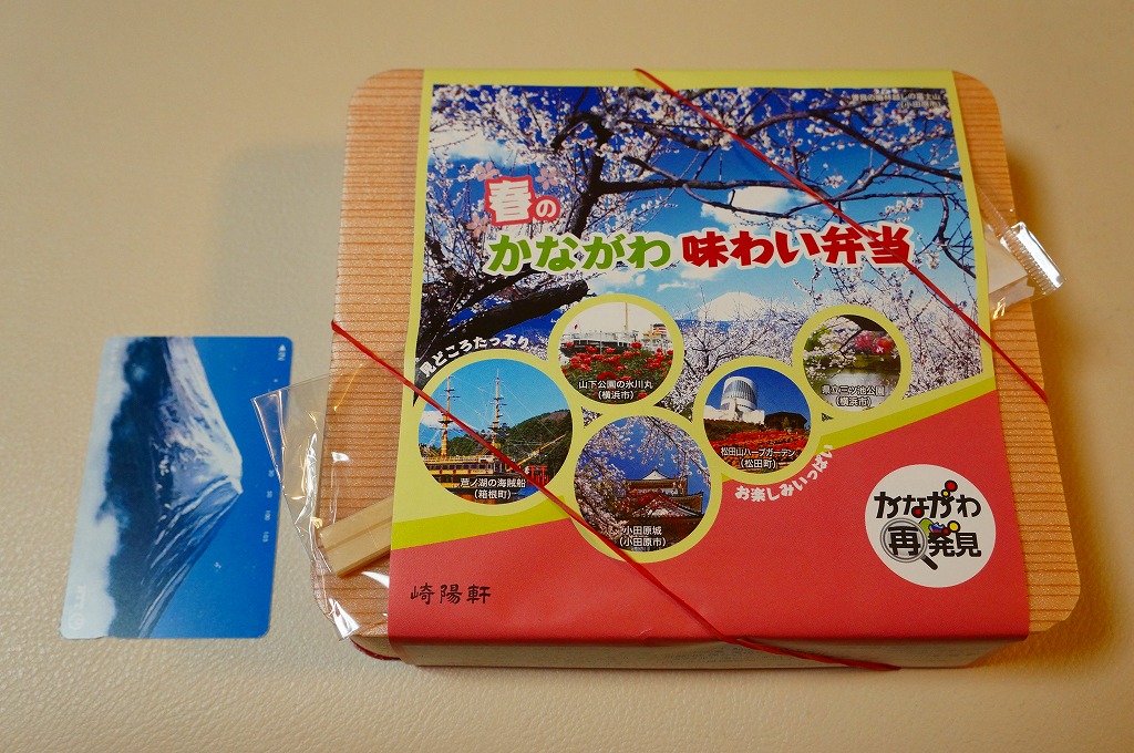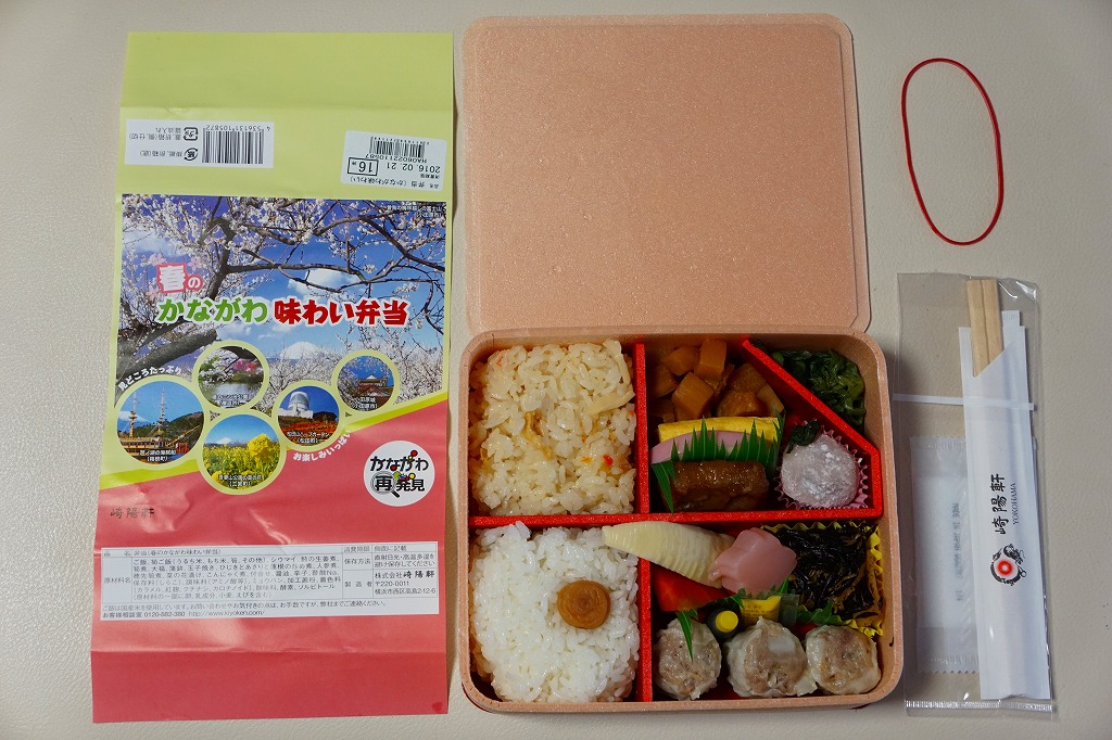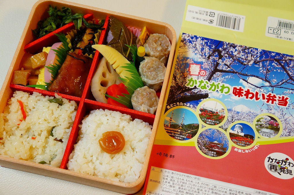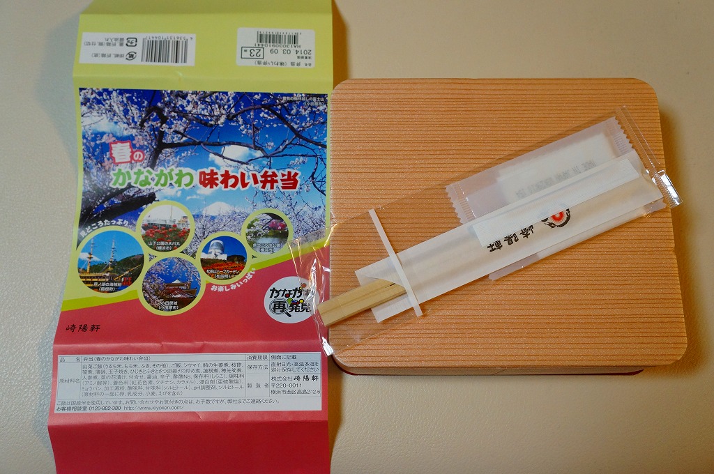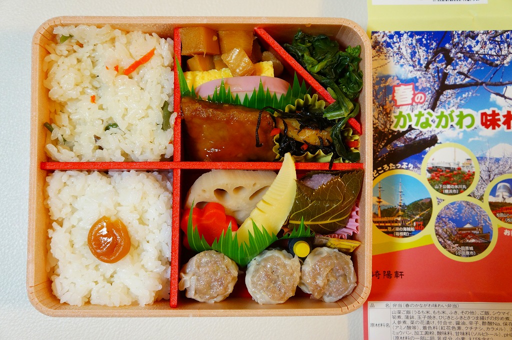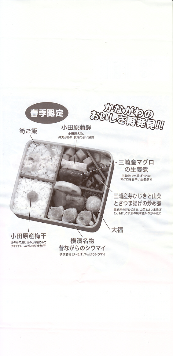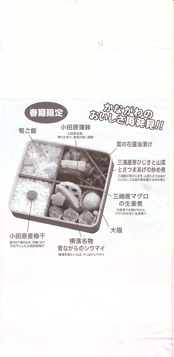 2014(平成26)年3月1日から31日までの販売。秋や冬ではなく春に初めて出てきた、かながわ味わい弁当。容器と価格と掛紙の意匠は昨秋と変わらず、しかし掛紙の写真は花が咲く春のものに差し替えられ、中身の一部にも春を感じる食材が使われる。山菜御飯と小田原産梅干の日の丸御飯、三崎産マグロ生姜煮、三浦産芽ひじきとフキとさつま揚げの炒め煮、小田原かまぼこ、玉子焼、タケノコやレンコンなどの煮物、菜の花の醤油漬、桜餅、シウマイ3個。