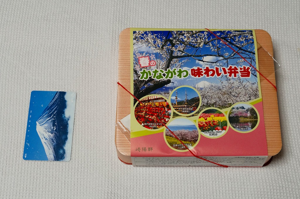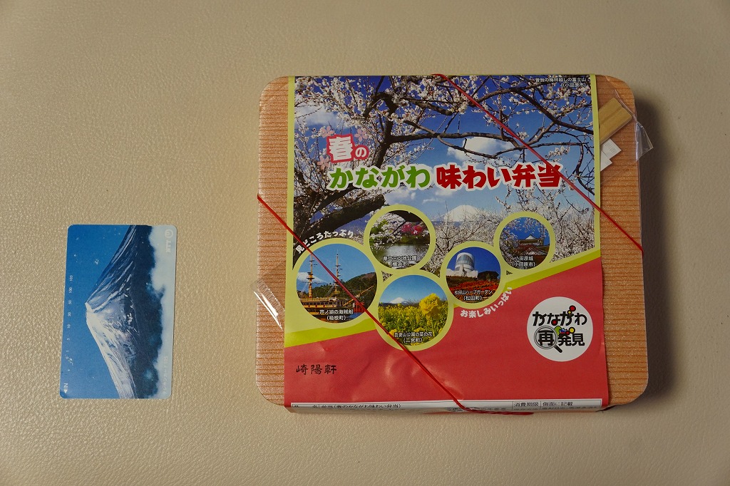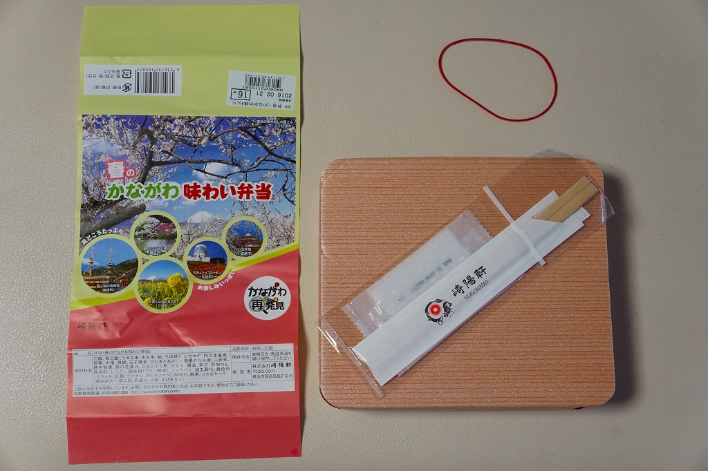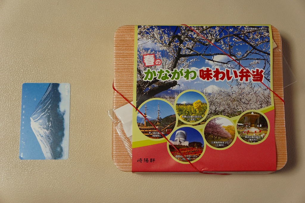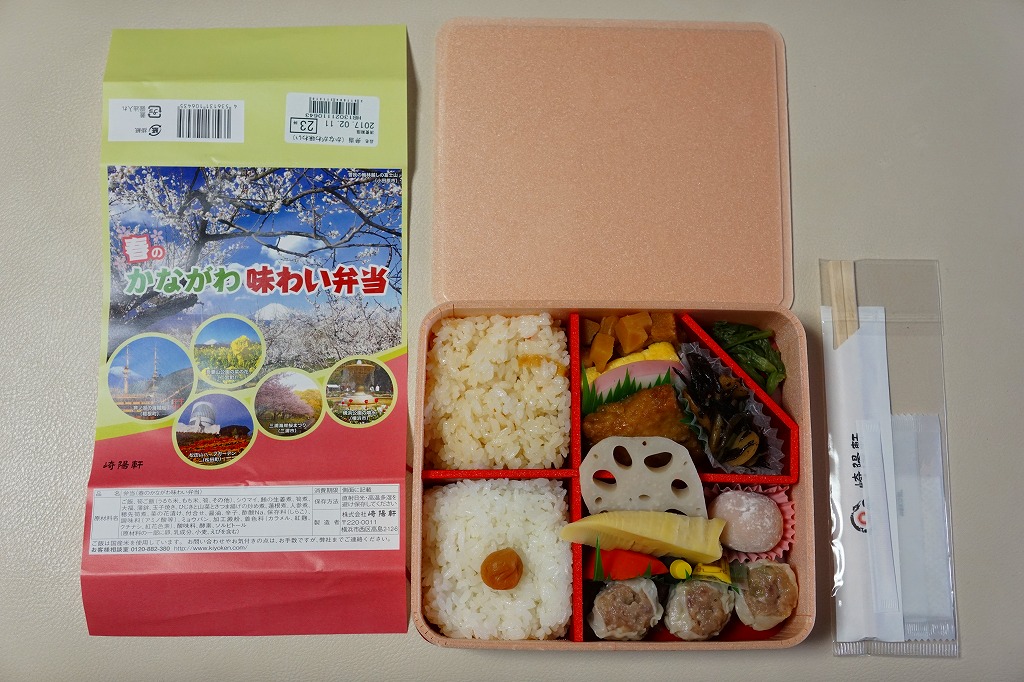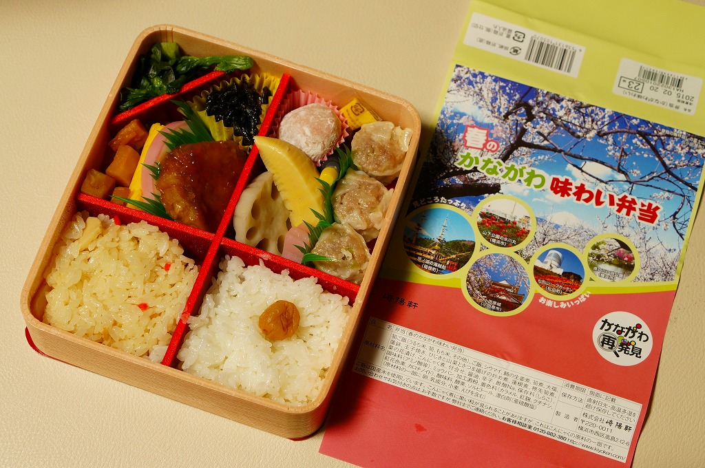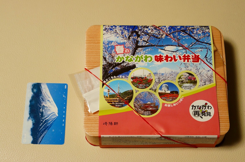 2014(平成26)年3月1日から31日までの販売。秋や冬ではなく春に初めて出てきた、かながわ味わい弁当。容器と価格と掛紙の意匠は昨秋と変わらず、しかし掛紙の写真は花が咲く春のものに差し替えられ、中身の一部にも春を感じる食材が使われる。山菜御飯と小田原産梅干の日の丸御飯、三崎産マグロ生姜煮、三浦産芽ひじきとフキとさつま揚げの炒め煮、小田原かまぼこ、玉子焼、タケノコやレンコンなどの煮物、菜の花の醤油漬、桜餅、シウマイ3個。