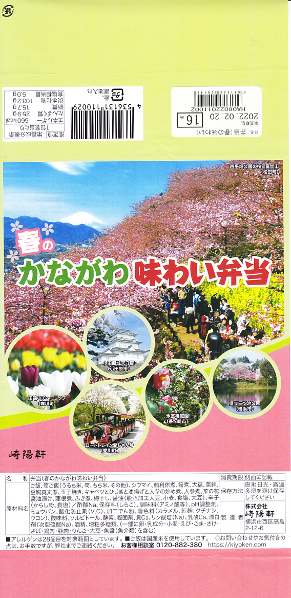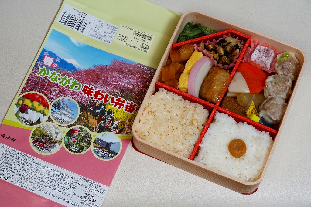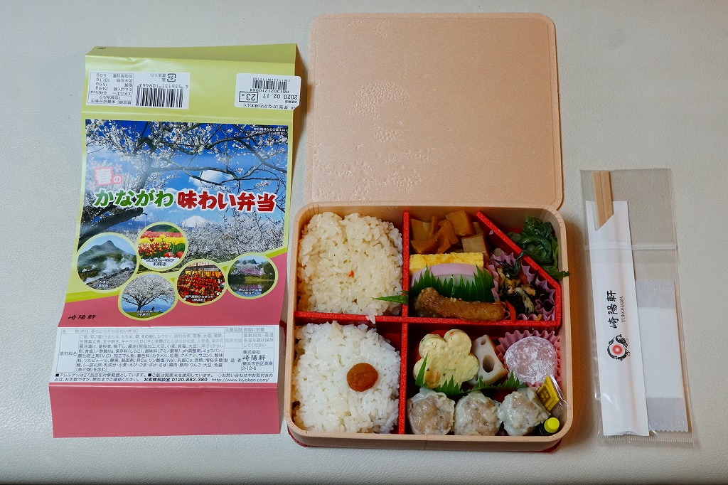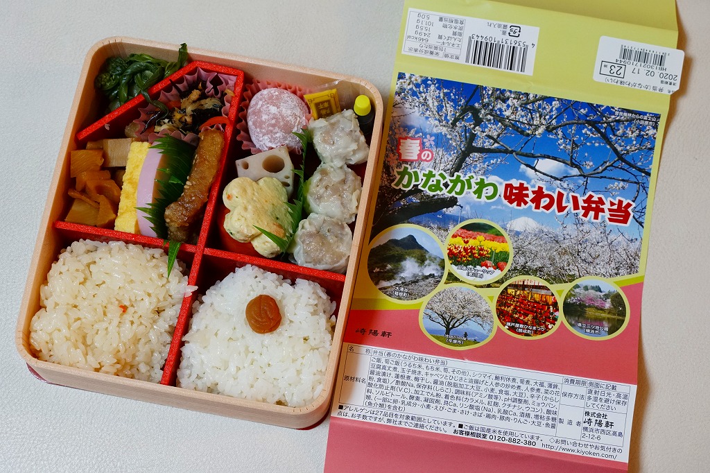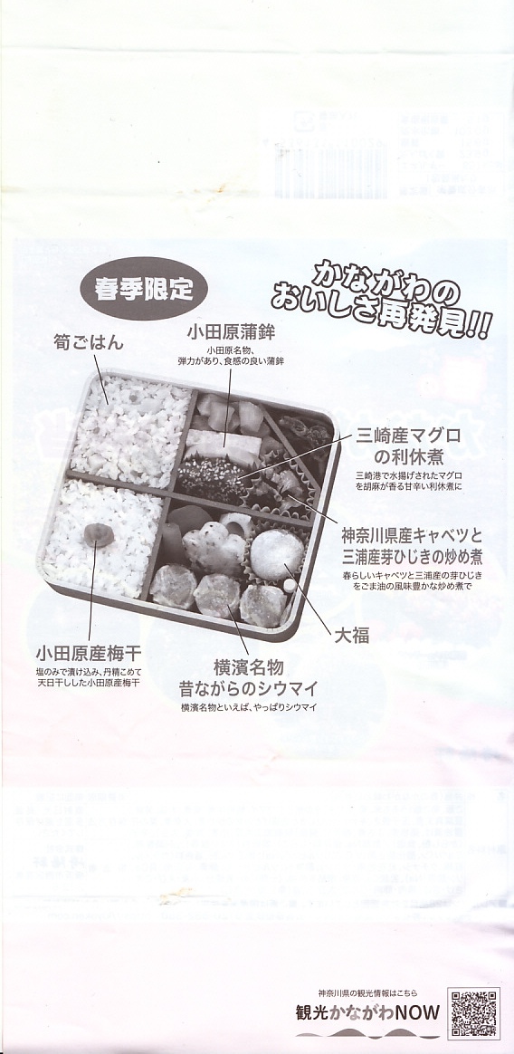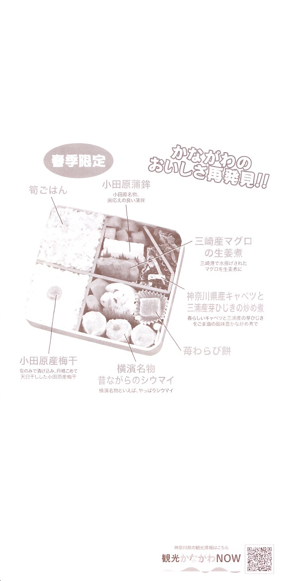横浜駅弁「かながわ味わい弁当」で7シーズン目の「春」版で、2020(令和2)年2月1日から4月15日までの販売で、やはり神奈川県とのタイアップ企画。掛紙の写真に「大涌谷(箱根町)」「渋田川の桜(平塚市)」「瀬戸屋敷ひなまつり(開成町)」が加わった。