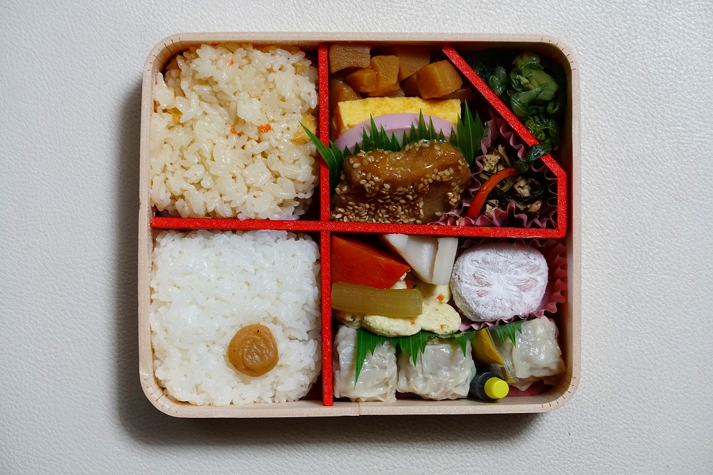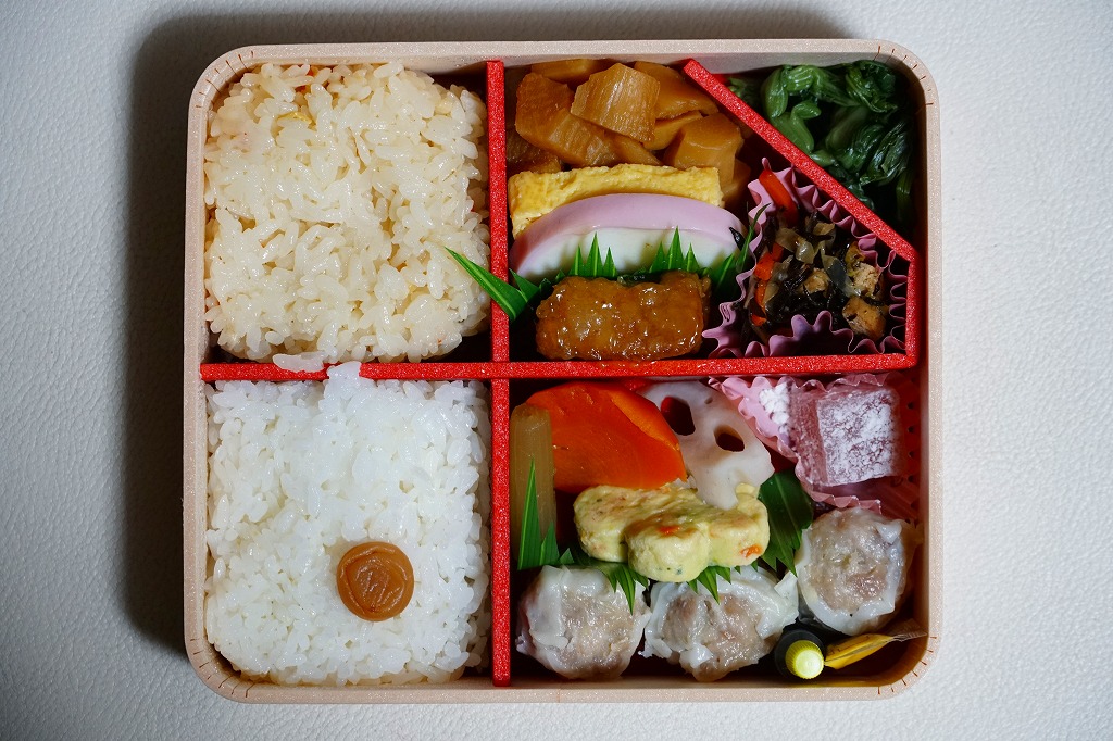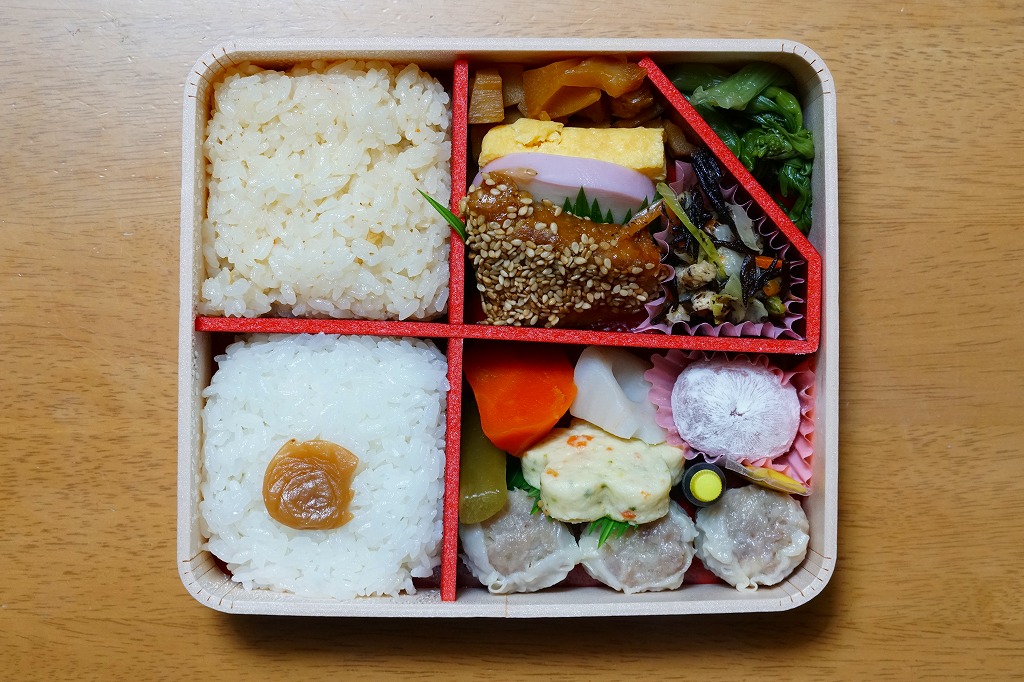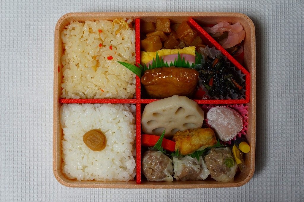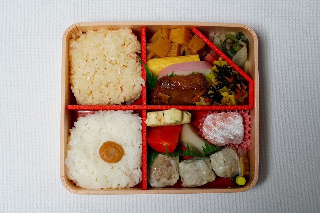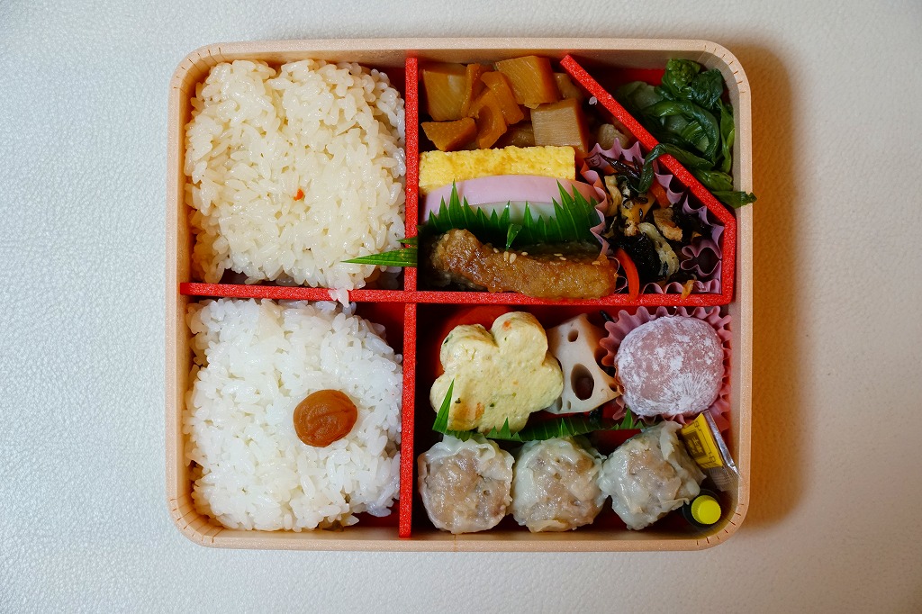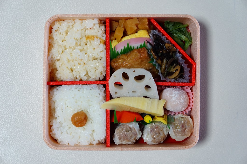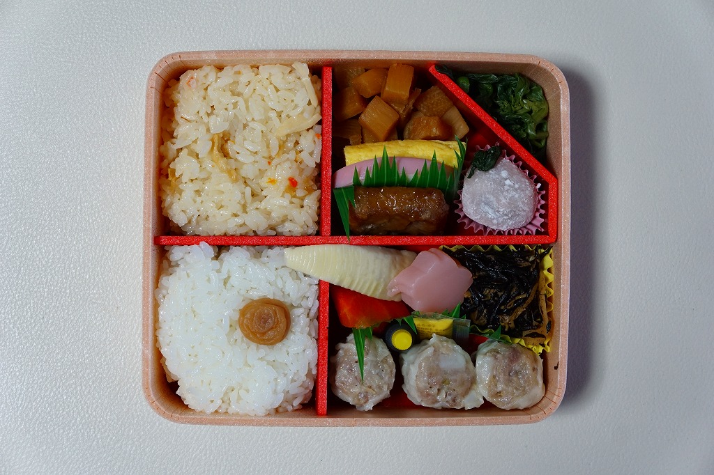 中身は前年とほぼ同じで、タケノコ御飯と日の丸御飯、マグロ利久煮、芽ひじきとキャベツと油揚げの炒め煮、かまぼこ、タケノコ煮、ニンジンやレンコンの煮物、花形豆腐煮、玉子焼、菜の花の醤油漬け、大福(つぶ餡)、シウマイ3個。