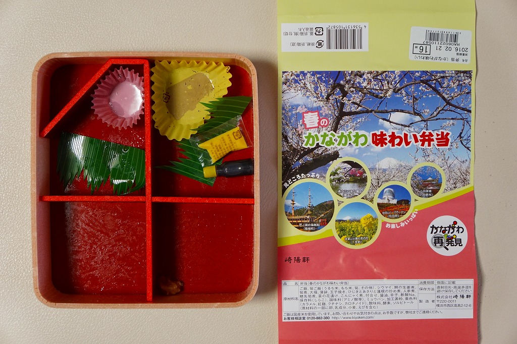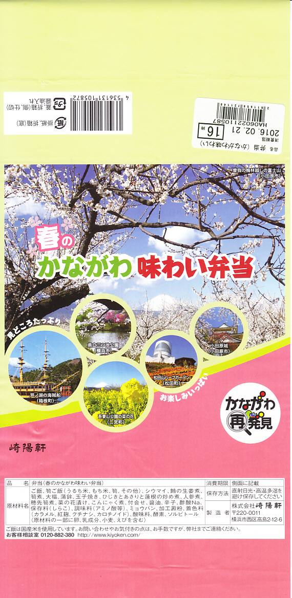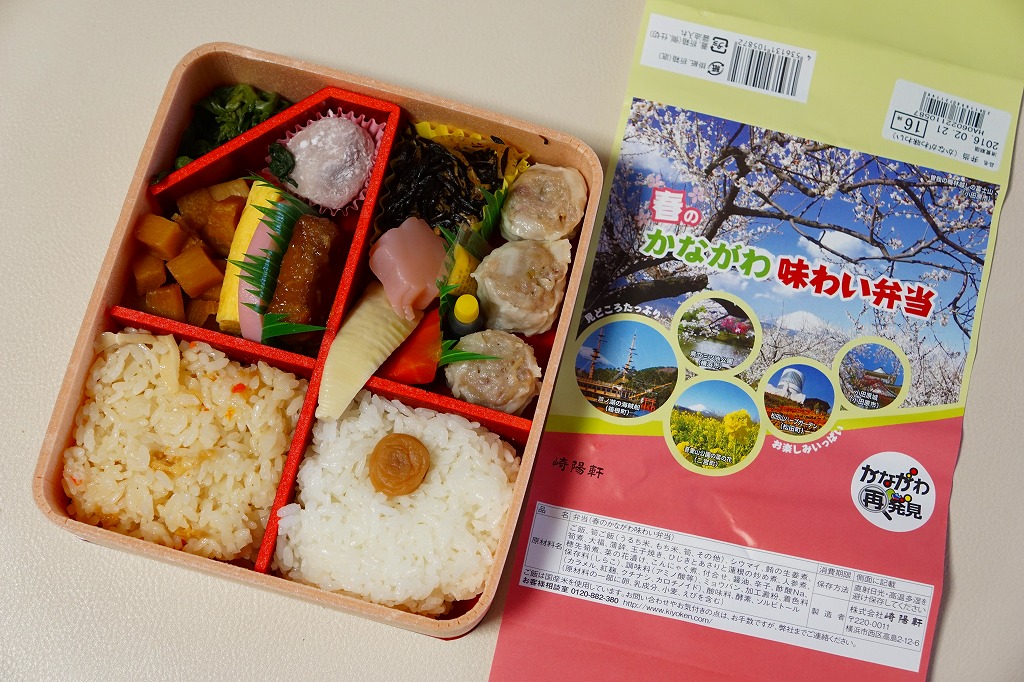 横浜駅弁「かながわ味わい弁当」の2016(平成28)年の春版で、やはり神奈川県の「かながわ再発見キャンペーン」とのタイアップ企画として、前年より半月間長い2016年2月1日から4月15日まで販売。掛紙の風景写真には、春の桜と富士と神奈川県内の各種イベントが使われる。中身は今回も、小田原産梅干の日の丸御飯、タケノコ御飯、三崎産マグロ生姜煮、三浦産芽ひじきとアサリと薩摩揚の炒め煮、小田原蒲鉾、大福、菜の花漬、昔ながらのシウマイ3個などと、ほとんど同じ。