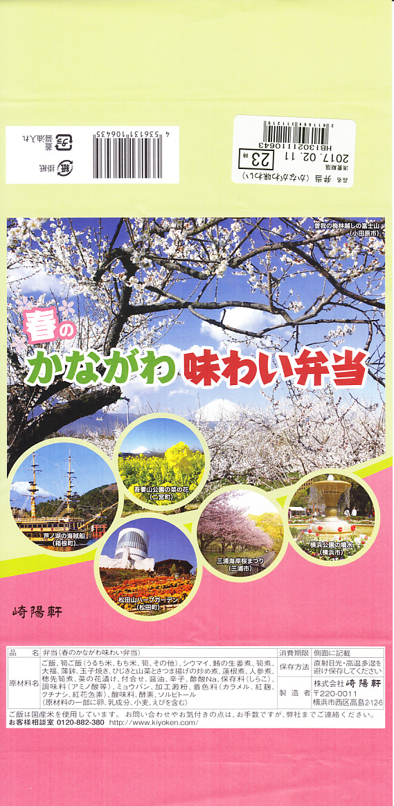 横浜駅弁「かながわ味わい弁当」で4シーズン目の「春」版で、2017(平成29)年2月1日から4月15日までの販売で、やはり神奈川県とのタイアップ企画。掛紙は前年とほとんど同じ。5つの円写真に「三浦海岸桜まつり(三浦市)」と「横浜公園の噴水(横浜市)」が登場。「かながわ再発見」のアイコンが消えた。