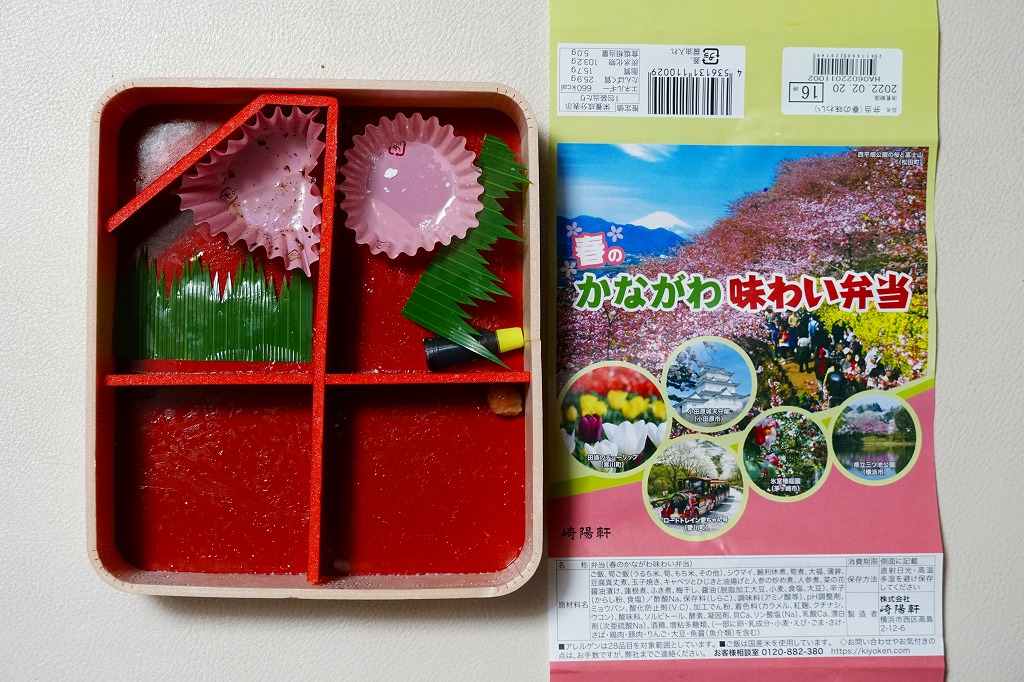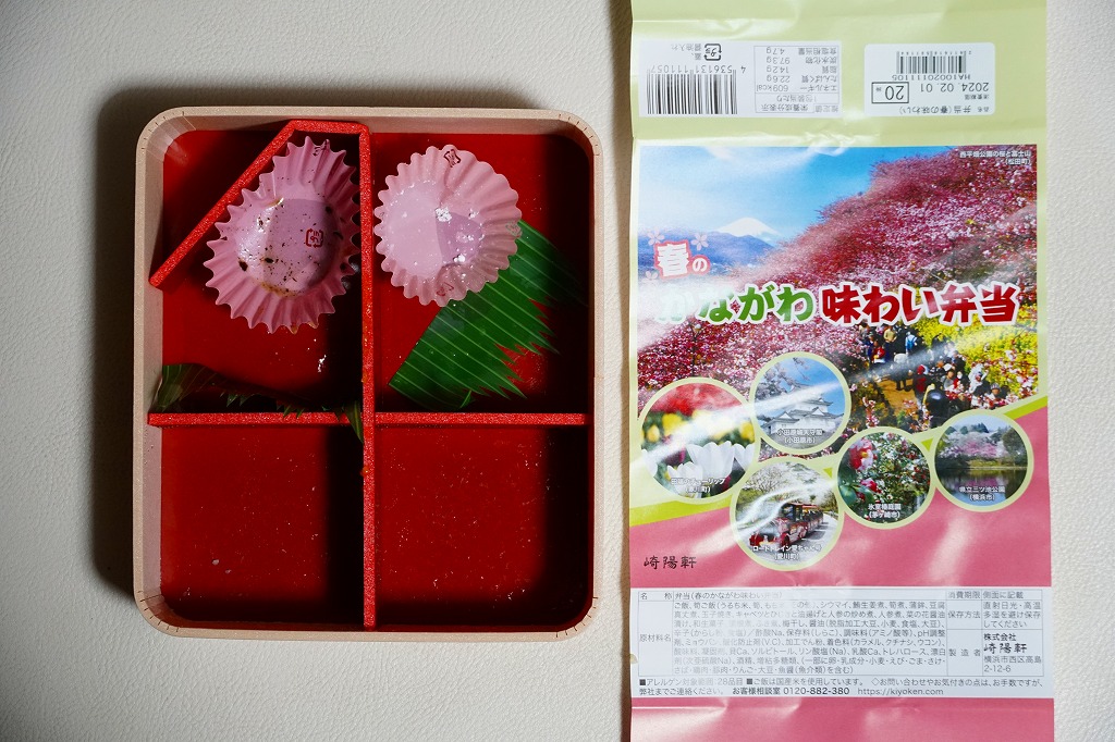 中身は前年と同じで、タケノコ御飯と日の丸御飯、マグロ利久煮、芽ひじきとキャベツと油揚げの炒め煮、かまぼこ、タケノコ煮、ニンジンやレンコンなどの煮物、花形豆腐煮、玉子焼、菜の花の醤油漬け、大福(つぶあん)、シウマイ3個。掛紙の裏面に写真付きで記したお品書きでの、小田原蒲鉾のプロフィール「弾力があり、食感の良い蒲鉾」が、この年は「歯応えの良い蒲鉾」に変わった。
