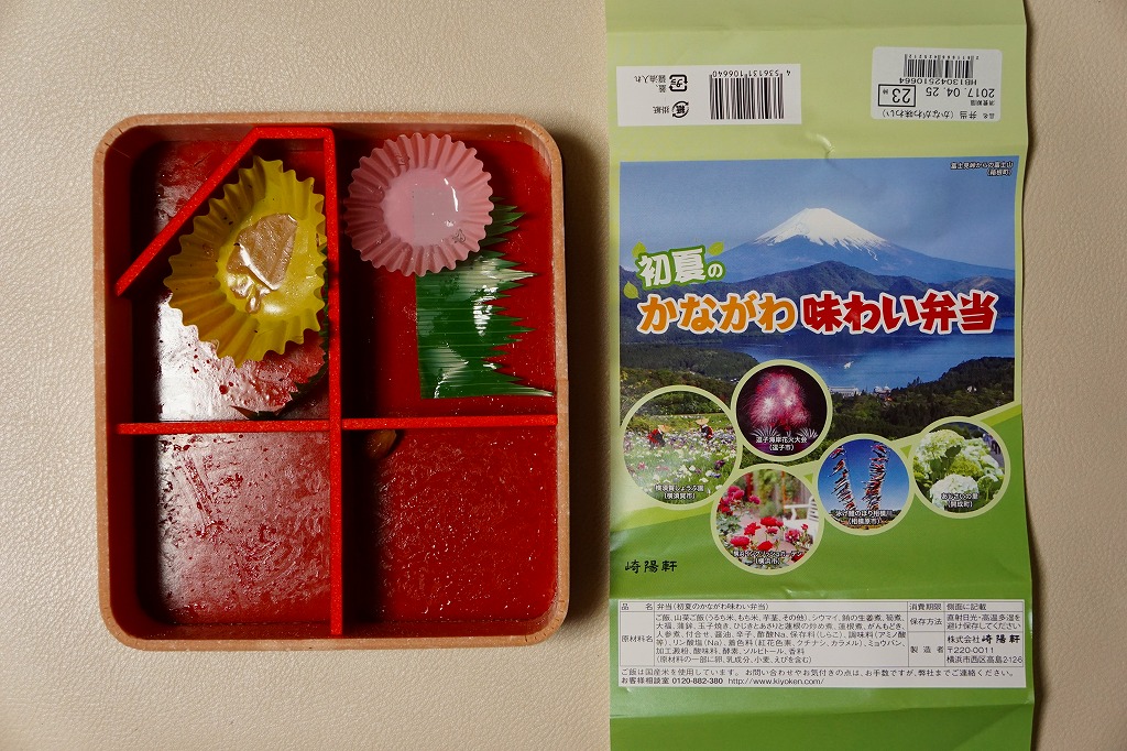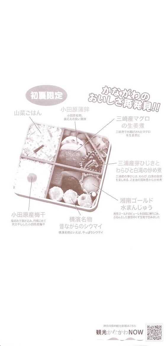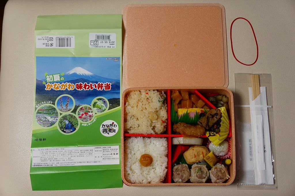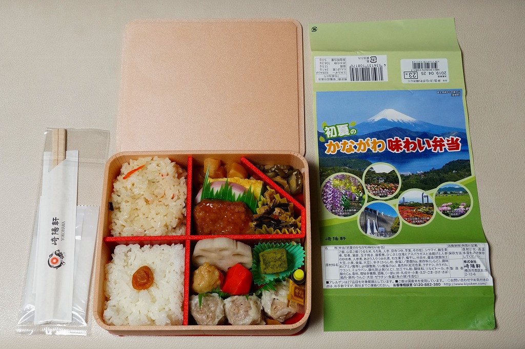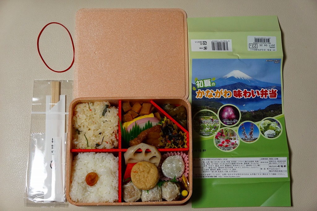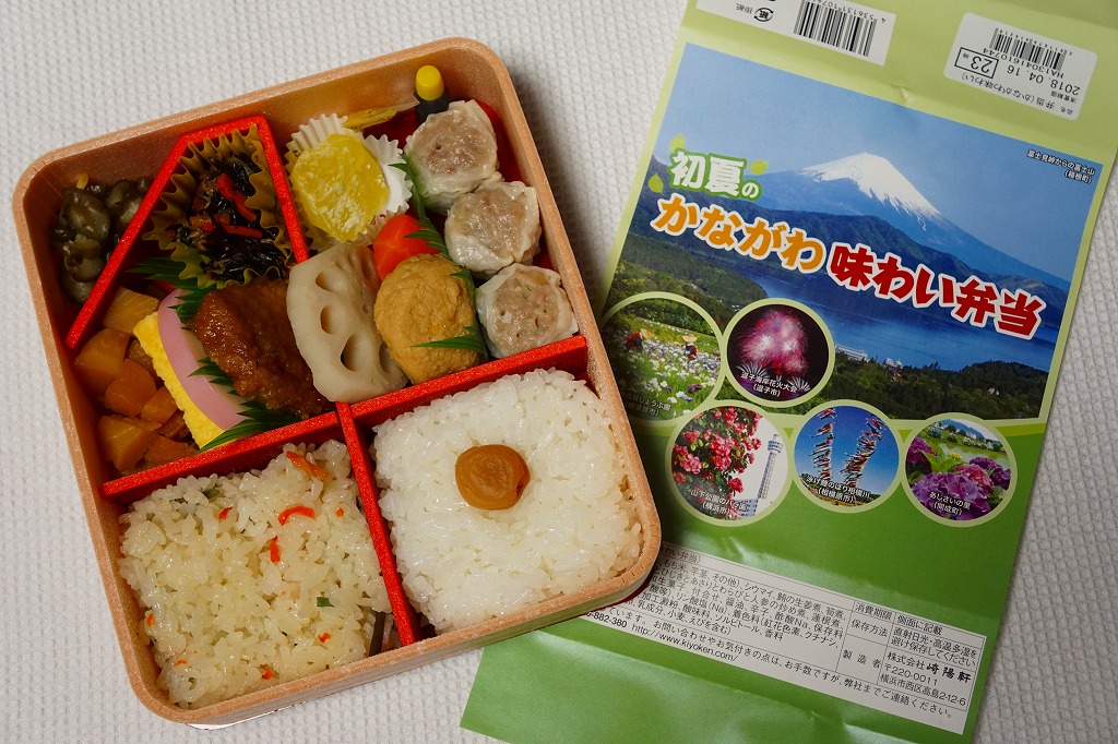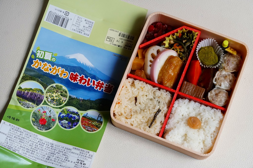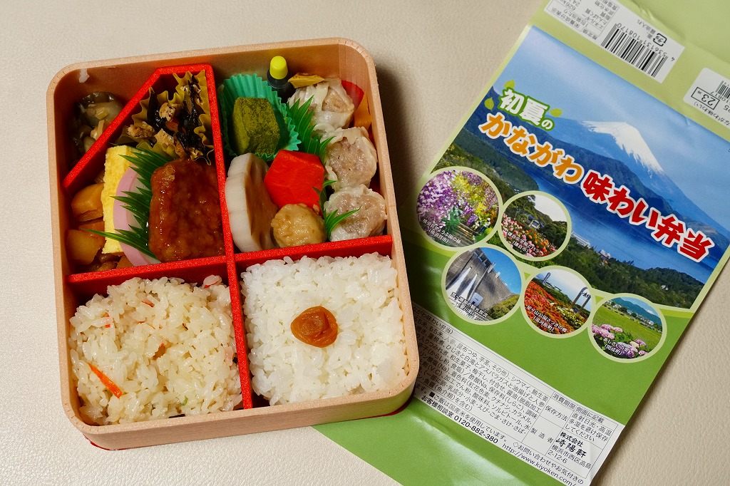 横浜駅弁「かながわ味わい弁当」では初登場の「初夏」版で、2016(平成28)年4月16日から6月15日までの販売。やはり神奈川県の「かながわ再発見キャンペーン」とのタイアップ企画とされる。掛紙の風景写真には、初夏の富士と神奈川県内の各種イベントが使われる。中身は今回も、小田原産梅干の日の丸御飯、山菜御飯、三崎産マグロ生姜煮、三浦産芽ひじきとふきと薩摩揚の炒め煮、小田原蒲鉾、よもぎ大福、しば漬、昔ながらのシウマイ3個などと、他の季節とだいたい同じ。