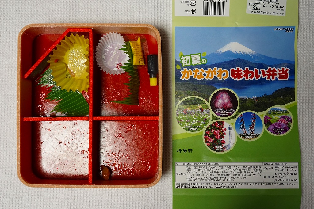 横浜駅弁「かながわ味わい弁当」で3シーズン目の「初夏」版で、2018(平成30)年4月16日から6月15日までの販売で、やはり神奈川県とのタイアップ企画。掛紙の5つの円写真に「山下公園のバラ園(横浜市)」「あじさいの里(開成町)」が登場。