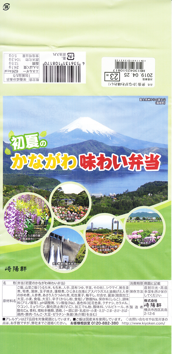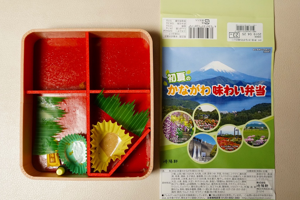 横浜駅弁「かながわ味わい弁当」で4シーズン目の「初夏」版で、2019(平成31)年4月16日から6月15日までの販売で、やはり神奈川県とのタイアップ企画。掛紙の5つの円写真はすべて差し替わり、「鎌倉文学館とバラ(鎌倉市)」「宮ヶ瀬湖の観光放流(愛川町)」「星ヶ山公園さつきの郷(湯河原町)」が初登場。
