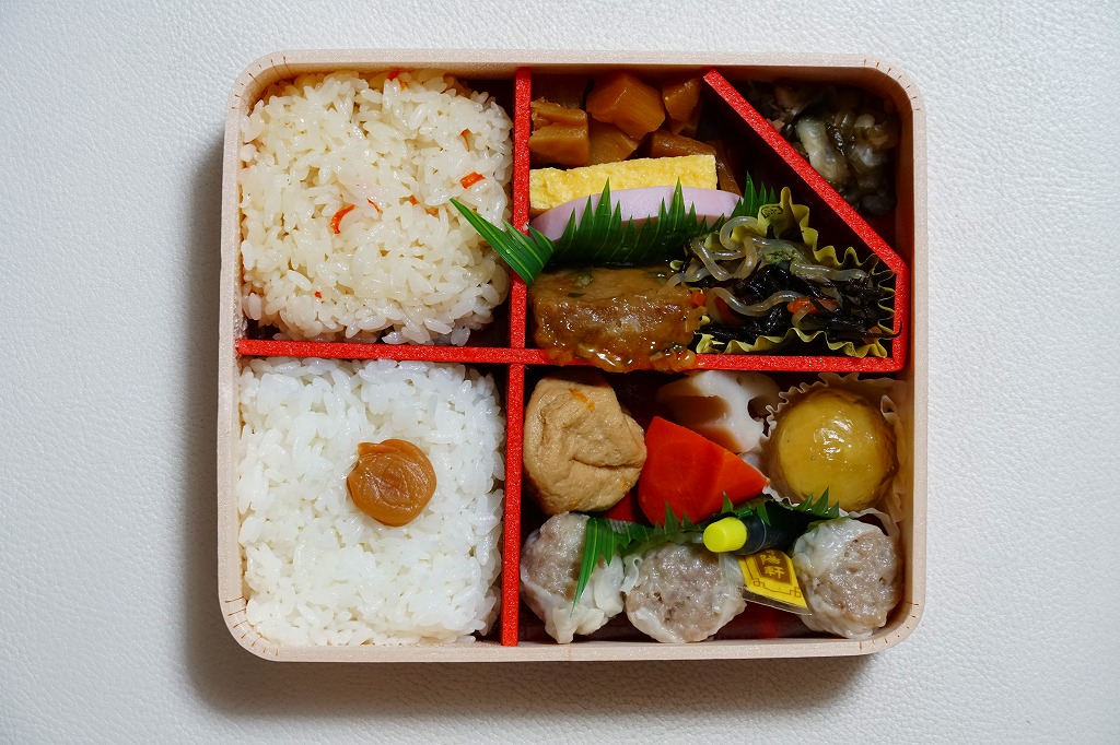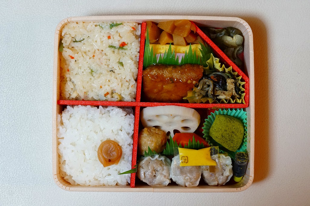 中身は昨初夏とほとんど同じ。三崎産マグロの生姜煮、三浦産芽ひじきとアサリなどの炒め煮、小田原蒲鉾、山菜御飯、小田原産梅干を使う日の丸御飯、きゅうりとみょうがの柴漬け、よもぎ大福、シウマイ3個などが入る。昨年と同じはずの「山菜ご飯」が油っぽい感じで、味の変化はあったと思う。