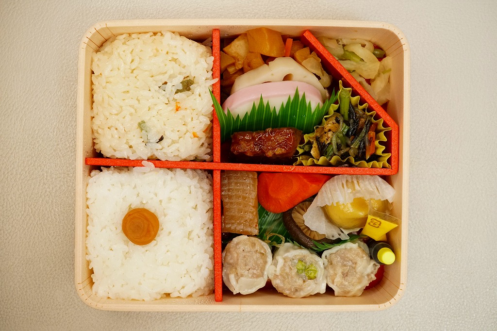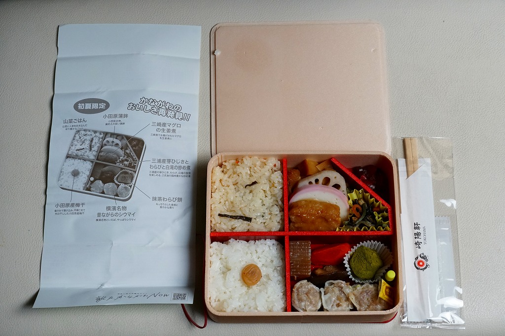 中身は昨初夏と、だいたい同じ。三崎産マグロの生姜煮、三浦産芽ひじきとわらびと白滝の炒め煮、小田原蒲鉾、山菜ごはん、小田原産梅干を使う日の丸御飯、湘南ゴールド水まんじゅう、シウマイ3個などが入る。価格は50円上がり、千円の大台を超えた。