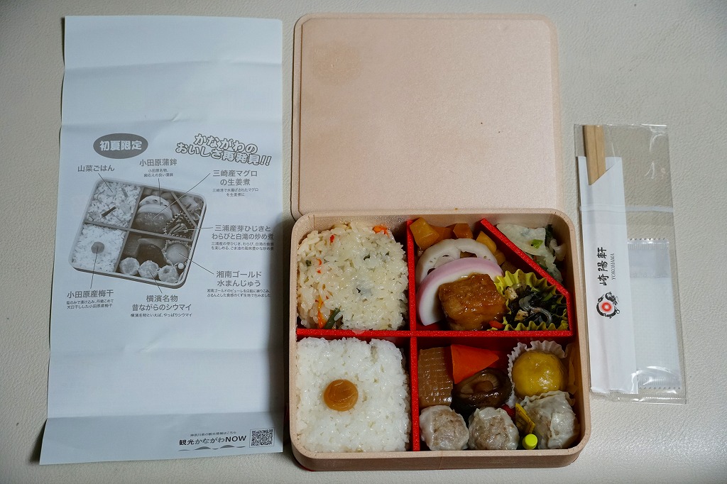 中身も昨初夏と、まったく同じ。三崎産マグロの生姜煮、三浦産芽ひじきとわらびと白滝の炒め煮、小田原蒲鉾、山菜ごはん、小田原産梅干を使う日の丸御飯、湘南ゴールド水まんじゅう、シウマイ3個などが入る。価格は90円も上がった。