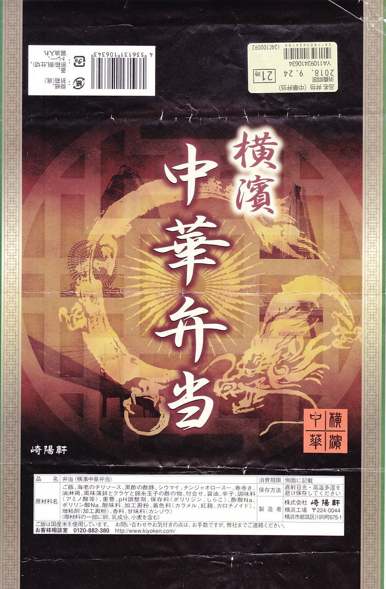 2018(平成30)年9月24日の調製と思われる、横浜駅弁の掛紙。下記の「横濱中華弁当」と同じものなので、掛紙に記されなくなった価格はおそらく1,100円。製造者が崎陽軒の横浜工場である。横浜工場と本社工場で、弁当の構造や味に違いを感じたという話は、まだ聞かれない。
