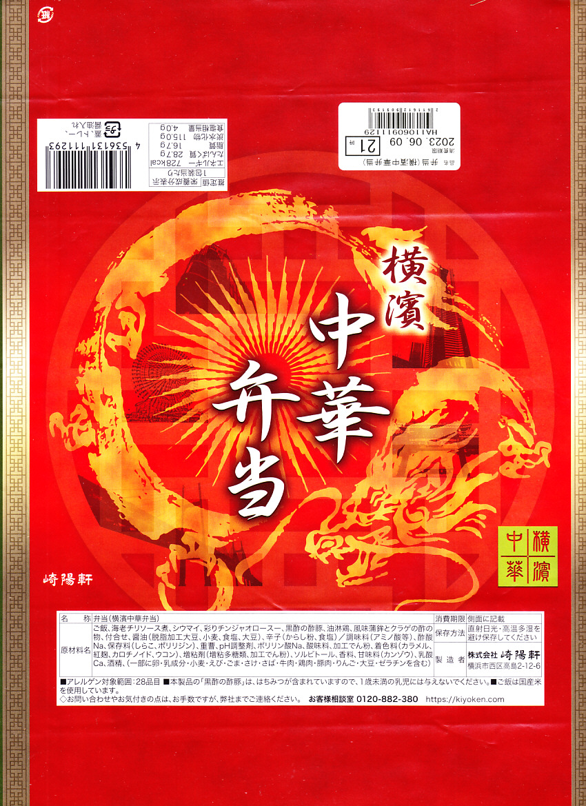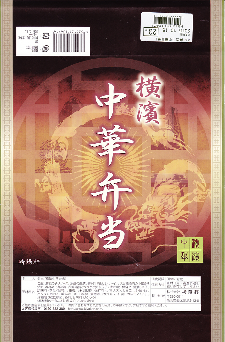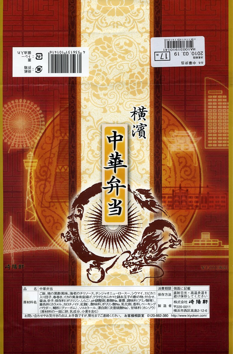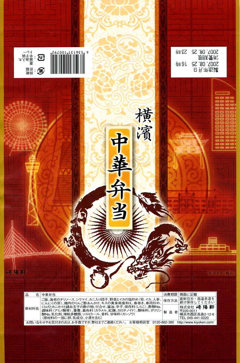 従前の横浜駅弁「横濱中華弁当」を、2008(平成20)年8月1日にリニューアル。容器と掛紙は従前と同じものを使う。中身は白御飯に鶏黒酢風味、エビチリ、肉野菜炒め、エビカニ団子、春巻き、イカの玉子揚げ、クラゲとカニカマと錦糸卵の酢の物、シウマイ1個など。雰囲気は変わっていないが、中身はかなり変わった。崎陽軒の駅弁という点では、シウマイが2個から1個に減ったのに値上げされたことが先に気になったが、中華駅弁の老舗であり最高峰の実力は変わらない。価格は2010年の購入時で1,000円、2010年9月1日の値下げで990円、2014年4月の消費税率改定で1,020円。2014年8月に上記へリニューアル。