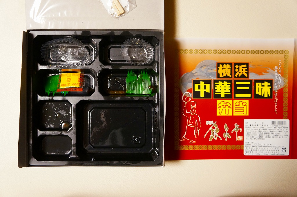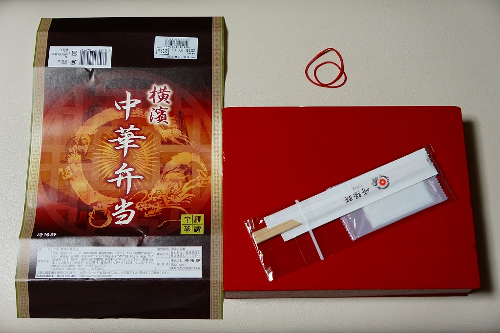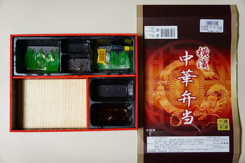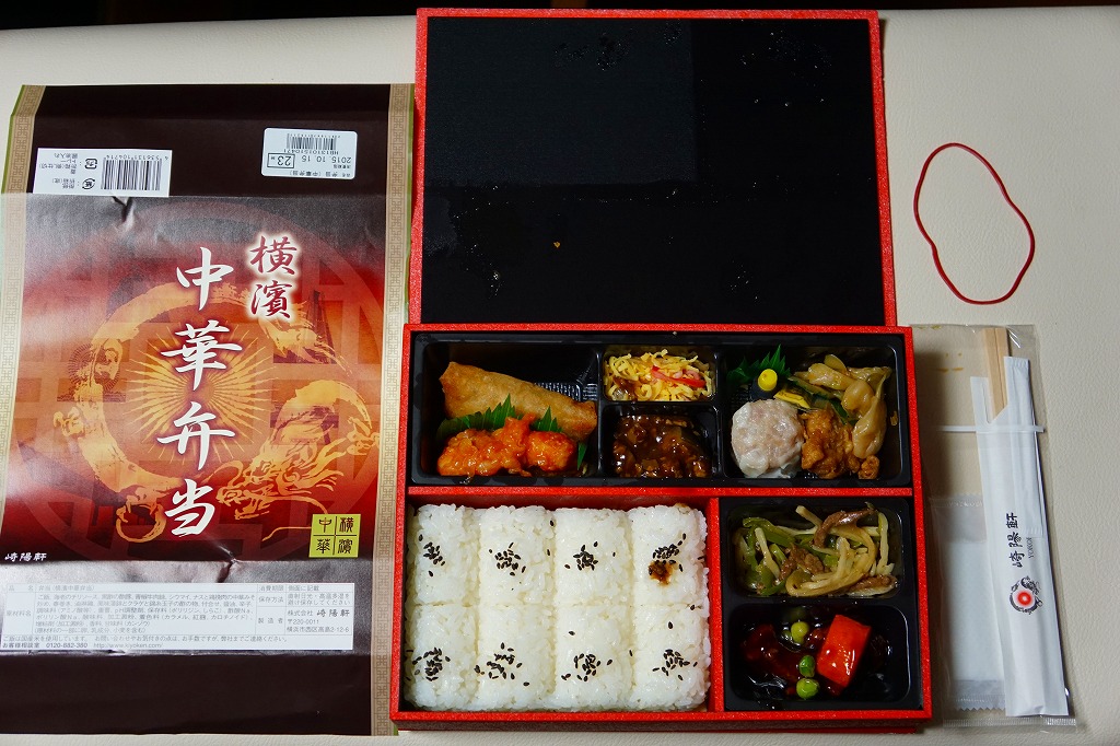 従前の横浜駅弁「横濱中華弁当」を、2014(平成26)年8月1日にリニューアル。中身は俵型に型押しした白御飯、エビチリ、酢豚、チンジャオロース(細切り肉野菜炒め)、ナスと鶏挽肉の炒め物、鶏肉揚、春巻、ザーサイ、クラゲとカニカマと錦糸卵の酢の物、特製シウマイ。黒い容器が赤くなり、掛紙が黒くなり、白御飯が俵型になり、メインでない具がちょっと入れ替わっただけ。あまり変わらないが、これがよい。