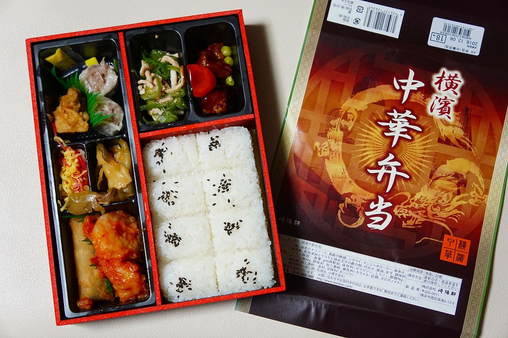 従前の横浜駅弁「横濱中華弁当」を、2016(平成28)年11月1日にリニューアル。といっても見てのとおり、リニューアル前とほぼ変わらない。中身は俵型に型押しした白御飯、エビチリ、酢豚、チンジャオロース(細切り肉野菜炒め)、ユーリンチー(鶏唐揚のようなもの)、春巻、ザーサイ、クラゲとカニカマと錦糸卵の酢の物、シウマイ2個。シウマイの種類が変わったことと、掛紙右下の黄色いアイコンが赤くなったことが変化か。見た目も味も、ほぼ同じ。価格は2016年のリニューアル時で1,080円、2018年9月から1,100円。2019年7月に上記のものへリニューアル。