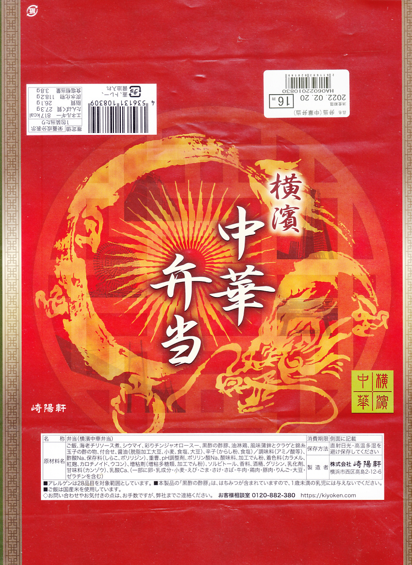 2000(平成12)年12月に発売。現在のものは2019(令和元)年7月のリニューアル。横浜駅の中華駅弁の最高峰であり、日本の中華駅弁の最高峰でもあると思う。赤く華やかな絵柄の掛紙に龍が舞う。中身は俵飯に海老チリ、酢豚、豚肉と野菜の炒め物チンジャオロース、カニカマやクラゲなどの酢の物、鶏唐揚でなく油淋鶏(ユーリンチー)とシウマイ3個。常温で食べるのに本格中華の香りがする、幕の内タイプの駅弁。価格は2019年のリニューアル時で1,080円、2022年10月から1,120円、2023年10月から1,160円。鳥インフルエンザの流行による鶏卵不足により、2023年5月8日から酢の物の錦糸卵がなくなっている。2025年2月から1,280円、2026年2月から1,390円。