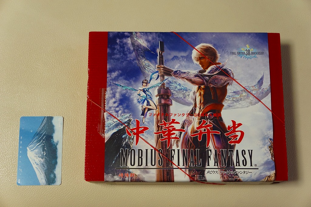 容器と中身と価格は、横浜駅弁「横浜中華弁当」とほぼ同じ。いくつかの具を抜き、シウマイを1個増の3個にして、ゲームキャラクター柄の磁器の醤油入れ「ひょうちゃん」を入れたもの。味もやはり、横浜中華弁当と同じ。選べる掛紙が「ブレイブエクスヴィアス」とこの「メビウス」の2種類、選べないひょうちゃんが「チョコボ」とこの「モーグリ」の2種類。