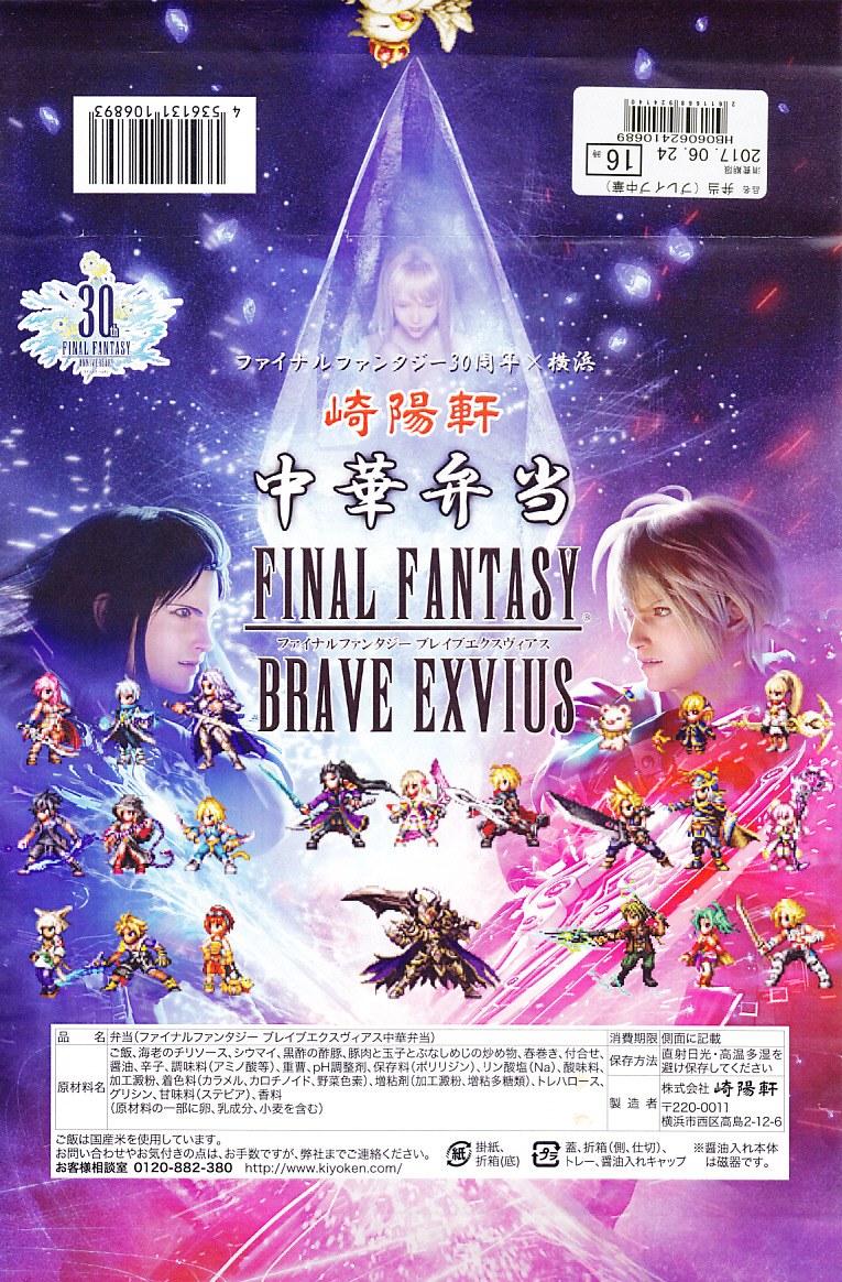 2017(平成29)年6月24日に購入した、記念弁当の掛紙。詳細は上記のとおり。この掛紙では「ファイナルファンタジー」シリーズのゲームキャラクターのうち「ブレイブエクスヴィアス」が描かれる。