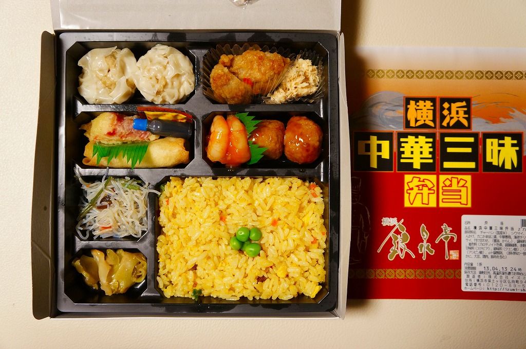 正方形の大きな専用紙箱を使用、トレーに入った中身は、炒飯、肉団子、焼売各種、春巻、春雨、ザーサイなどで商品名どおり。見栄えは特に美しいわけではないが、箸でつかみにくいほどパラパラの炒飯に10種類もの中華おかずは、食べ甲斐があった。調製元の公式サイトによると、JRCPで東京や新横浜、膳まいで東京、横浜、鶴見の各駅に進出したようだが、アイテム数を見ると軸足は羽田の空弁に置かれている模様。