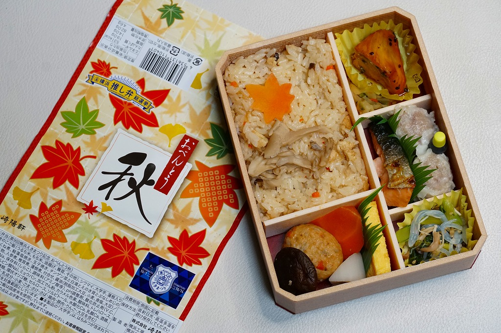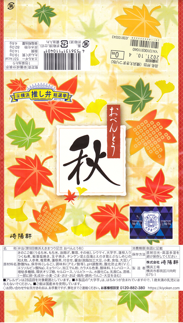 2021(令和3)年10月3日に購入した、横浜駅弁の掛紙。横浜駅に乗り入れる鉄道会社6社局などの共同イベント「横浜えきまつり」は、コロナ禍の2020(令和2)年には実施されず、2021(令和3)年は第9回として10月1日から14日までの開催で、この駅弁もその期間に横浜駅とその周辺の12店舗で販売された。えきまつり駅弁では初めて、季節の駅弁「おべんとう秋」を流用した。価格と中身はそれと同じ。