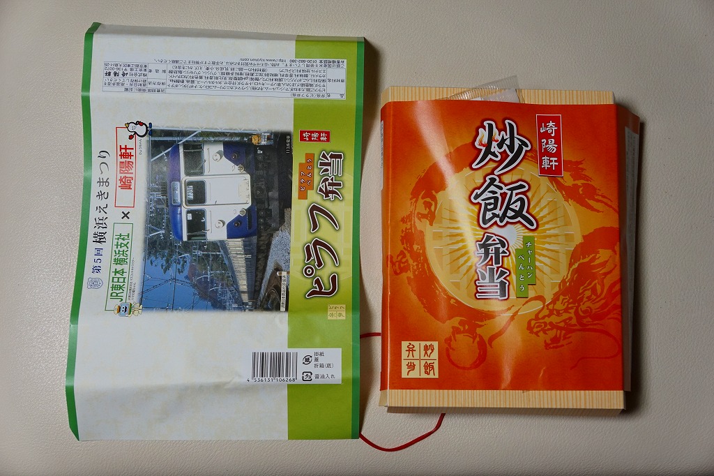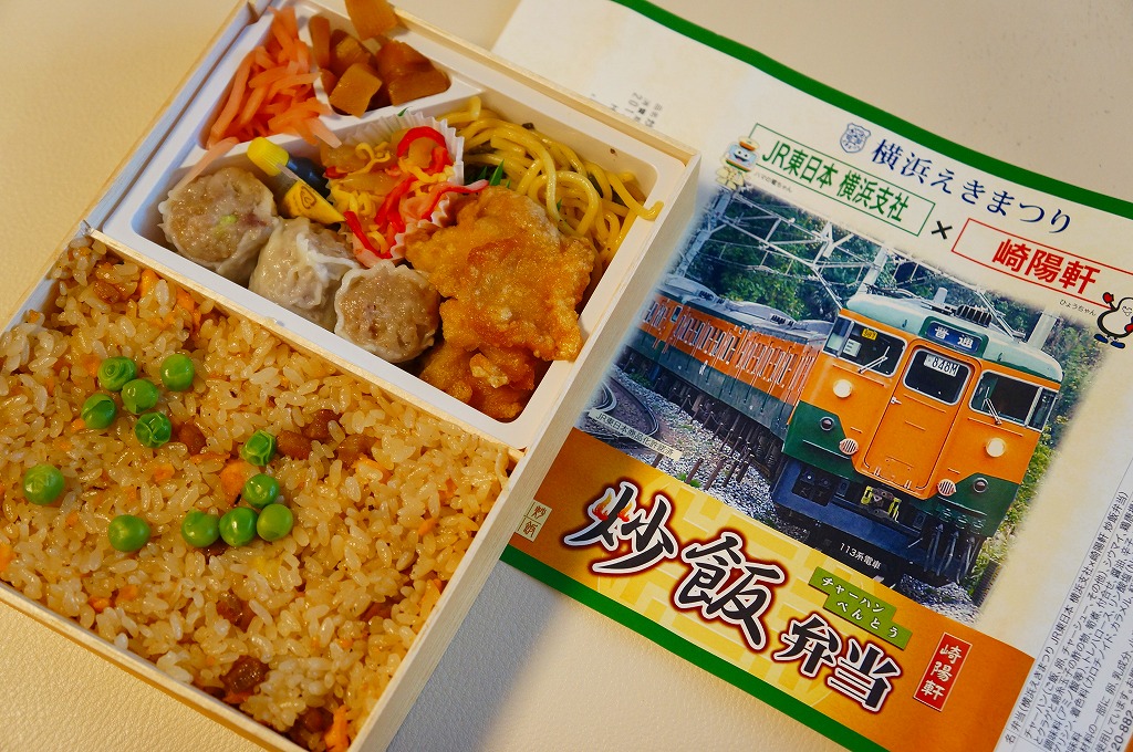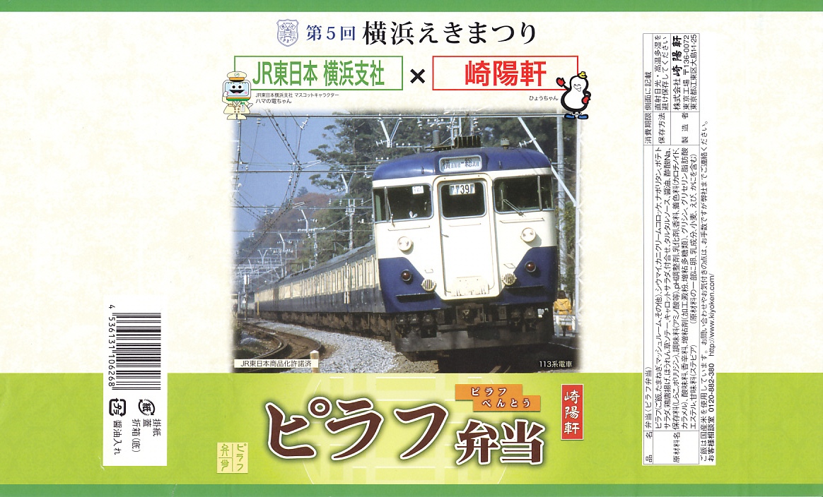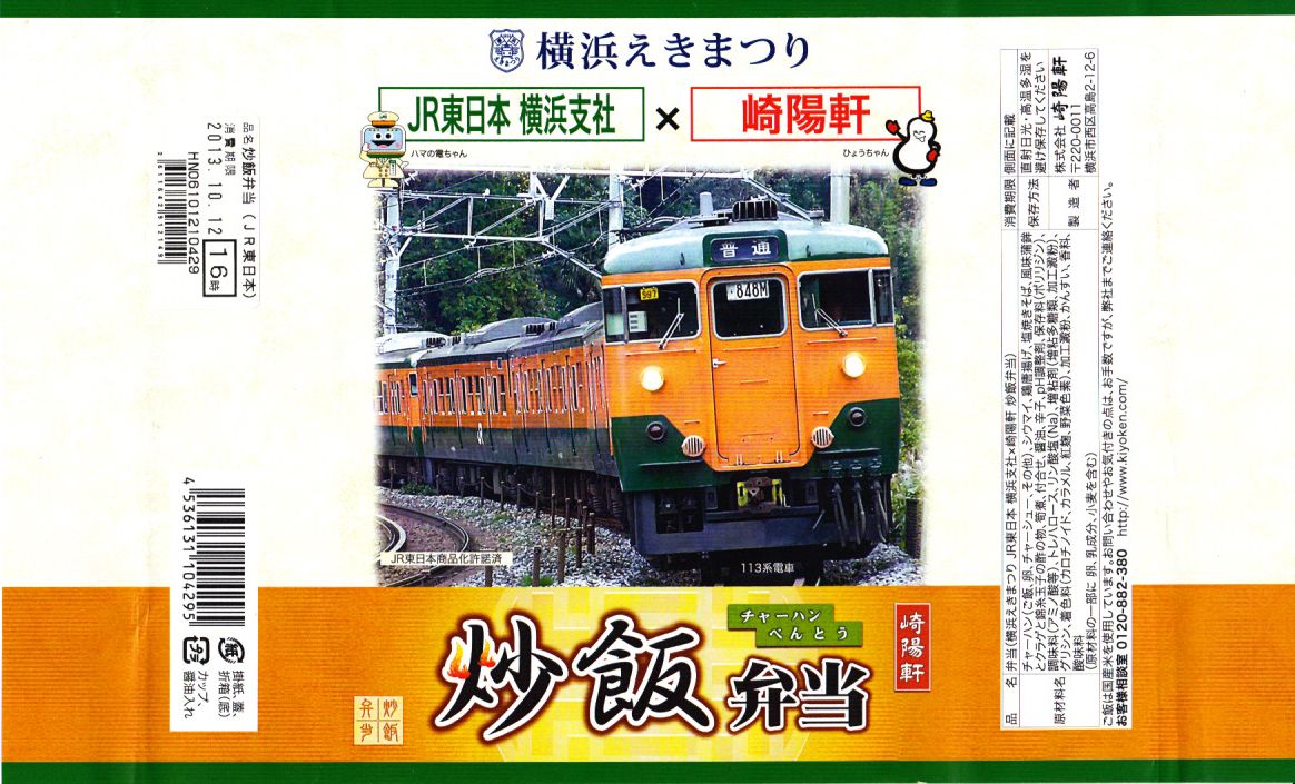 2013(平成25)年10月5日の調製である、横浜駅弁の掛紙。2013年10月4日から14日までの「第2回横浜えきまつり」の開催に合わせて、横浜駅に乗り入れる鉄道会社6社それぞれの電車を掛紙にしたバージョンの、JR東日本版。1963年から2006年3月まで東海道本線で運行されていた113系電車の写真を使う。中身は通常の「炒飯弁当」と同じ。